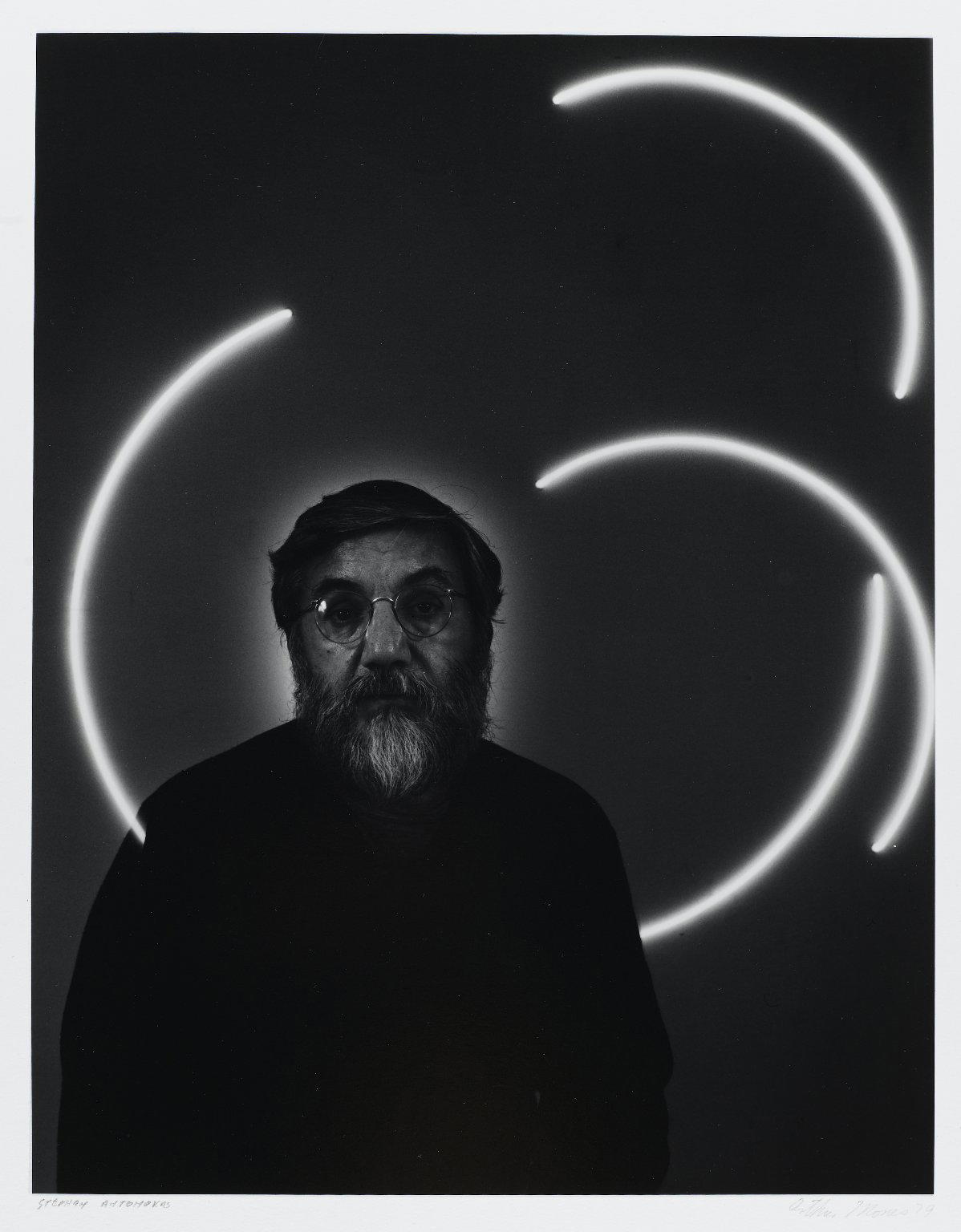 Arthur Mones (American, 1919–1998). Stephen Antonakos, 1979. Gelatin silver print, sheet: 14 x 10 3/4 in. (35.6 x 27.2 cm) image: 13 1/2 x 10 1/2 in. (26.7 x 34.5 cm). Brooklyn Museum, Gift of the artist, 1997.162.8. © Estate of Arthur Mones. (Photo: Brooklyn Museum)
