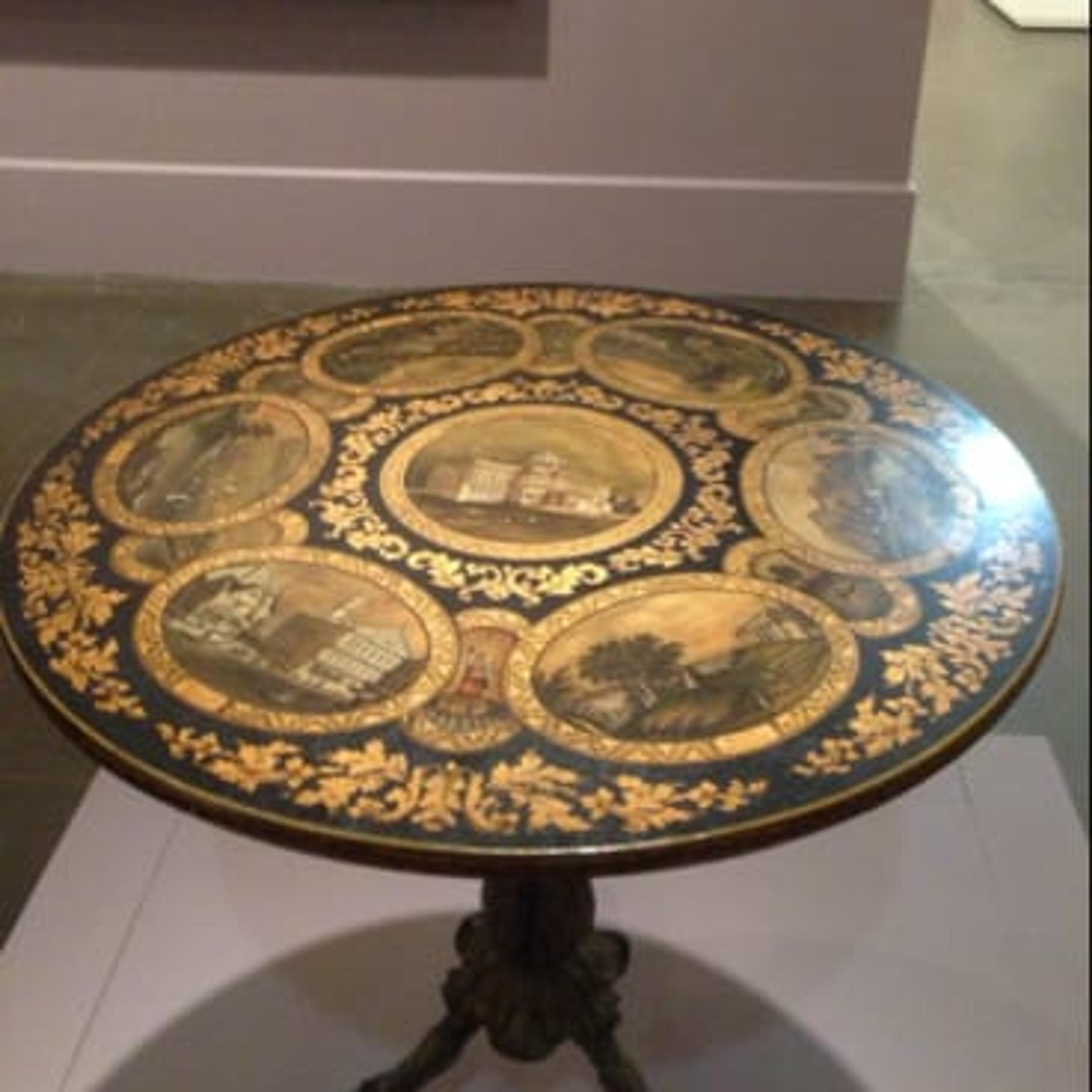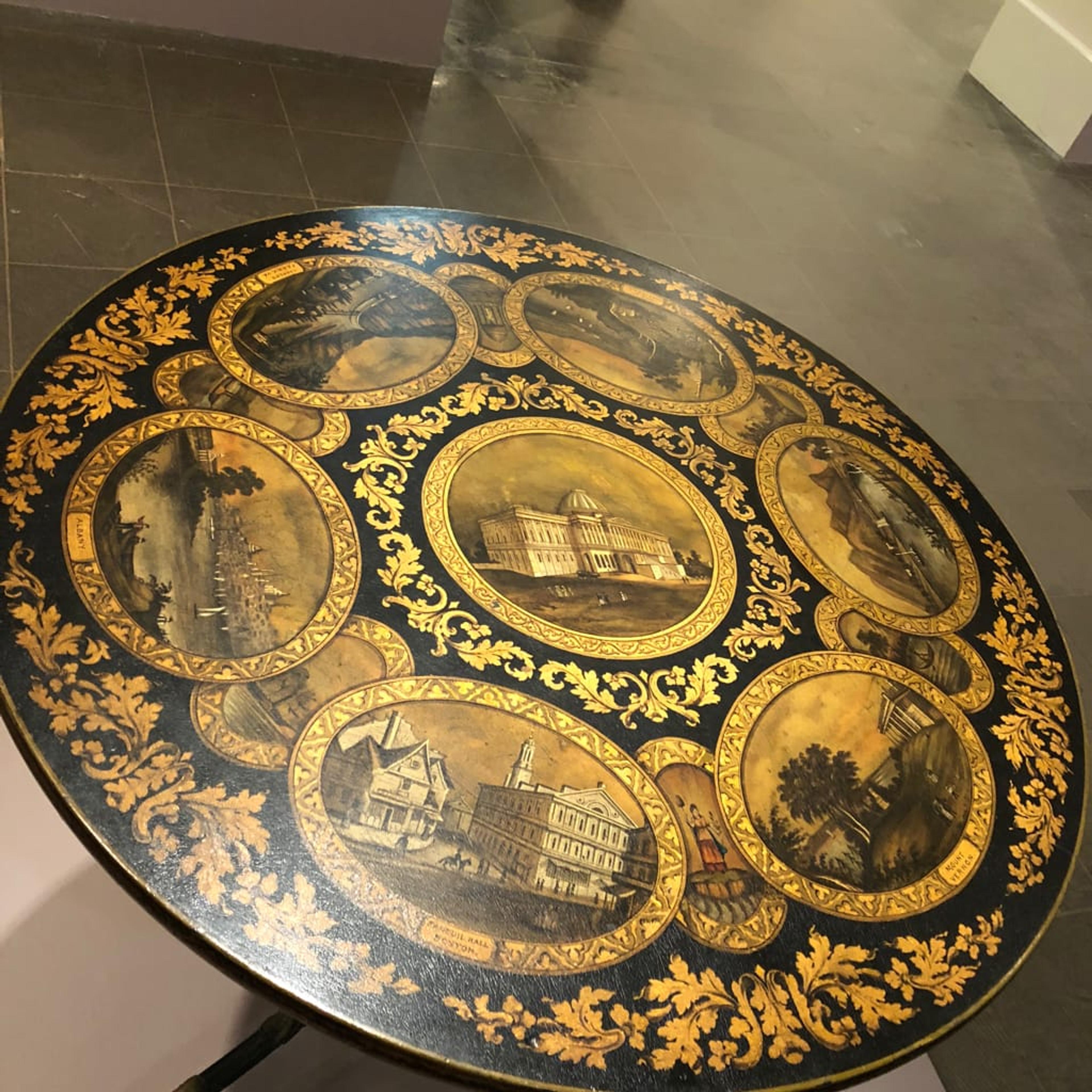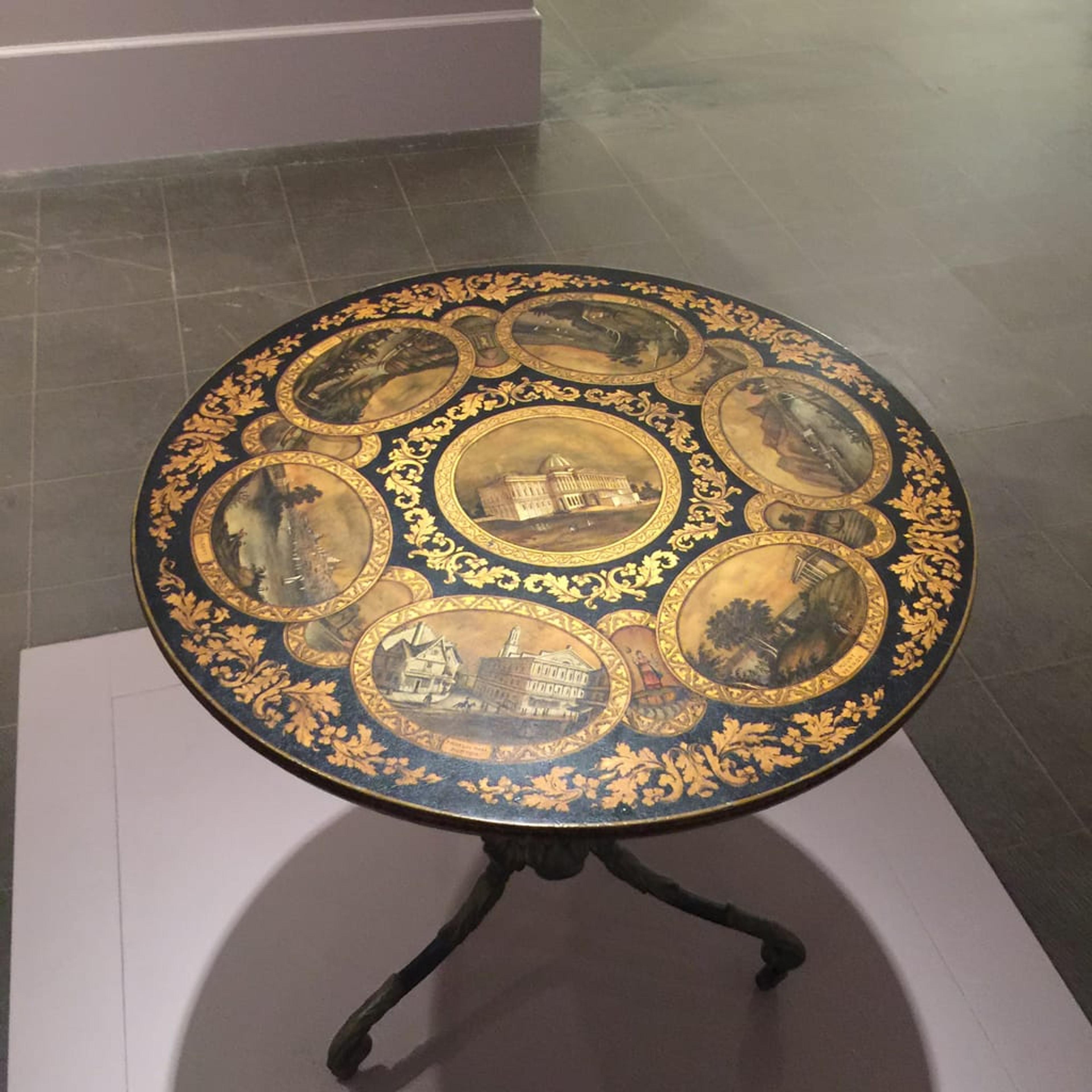 Of course! This table takes viewers on a tour of major cities and picturesque rural vistas in the United States. Symbolically at center is the Capital Building in Washington. In the early 19th century, landscape views on furniture and objects were a popular way of seeing distant landscapes without leaving one's home. Who has time to travel anyways?The views are derived from engravings based on drawings by William H. Bartlett which illustrate "American Scenery," in a 1840 publication.So it was furniture for a private home?Yes! Do you see the cast iron base? The use of metal furniture for the domestic home was a relatively new and modern idea; previously, the material was reserved for industrial and public spaces. Unfortunately, I don't have the name of the table’s original owner but there is a good chance that they would have lived here in New York.Tell me more.