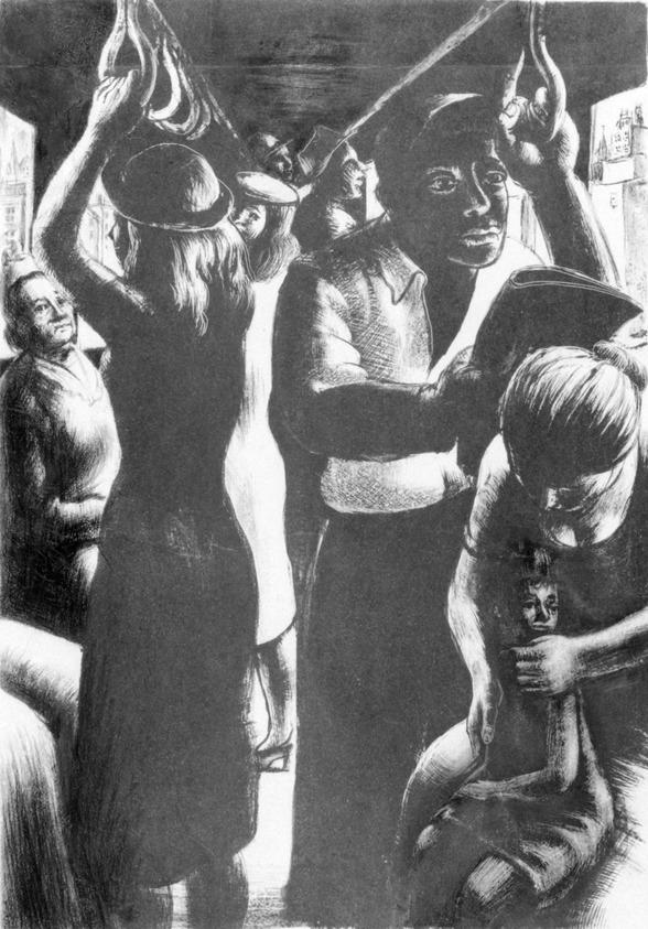 John Wilson (American, born 1922). Straphangers, 1947. Lithograph with hand drawing on paper, Sheet: 16 x 12 in. (40.6 x 30.5 cm) Image: 13 7/8 x 9 3/4 in. (35.2 x 24.8 cm). Brooklyn Museum, Alfred T. White Fund, 1998.156. (Photo: Brooklyn Museum)