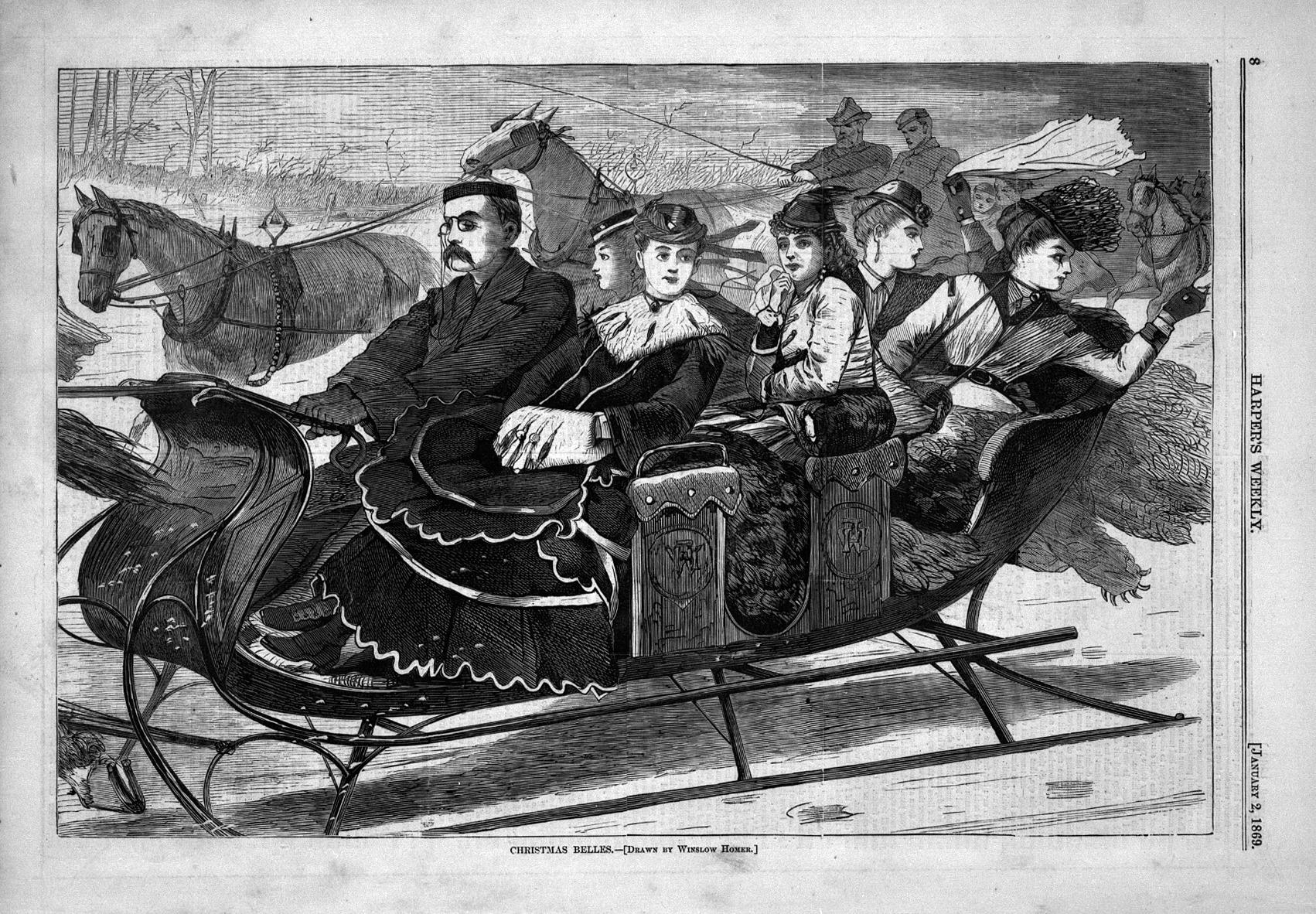 This image was not specifically related to a text except for a passing mention in the New Year’s editorial expressing the hope that “Jack Frost” would “return by Twelfth Night, and the ‘Christmas Belles’ shall yet skim the moonlit snow to the dance and the yellow glass of mulled wine.” Here a friendly race seems to take place. Speed is implied by the way that Homer has excluded the horse except for a telltale hoof and the tip of the tail, suggesting that the sleigh will soon disappear from sight as well. The two women seated in the back of the sleigh hold their scarves on high in a gesture of triumph as they gain ground against their competitors.