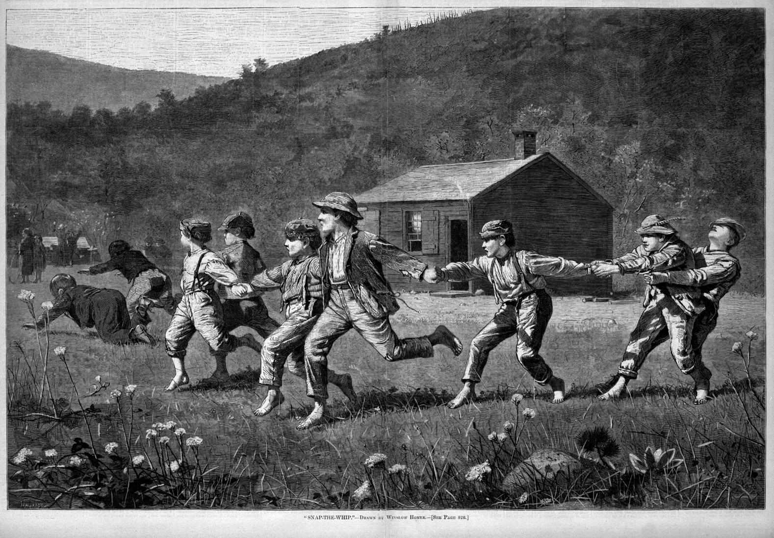 Winslow Homer (American, 1836–1910). "Snap-the-Whip", 1873. Wood engraving, Image: 13 3/4 x 20 3/4 in. (34.9 x 52.7 cm) Sheet: 15 7/8 x 21 7/8 in. (40.3 x 55.6 cm) Frame: 22 3/4 x 28 3/4 x 1 1/2 in. (57.8 x 73 x 3.8 cm). Brooklyn Museum, Gift of Harvey Isbitts, 1998.105.178. (Photo: Brooklyn Museum)