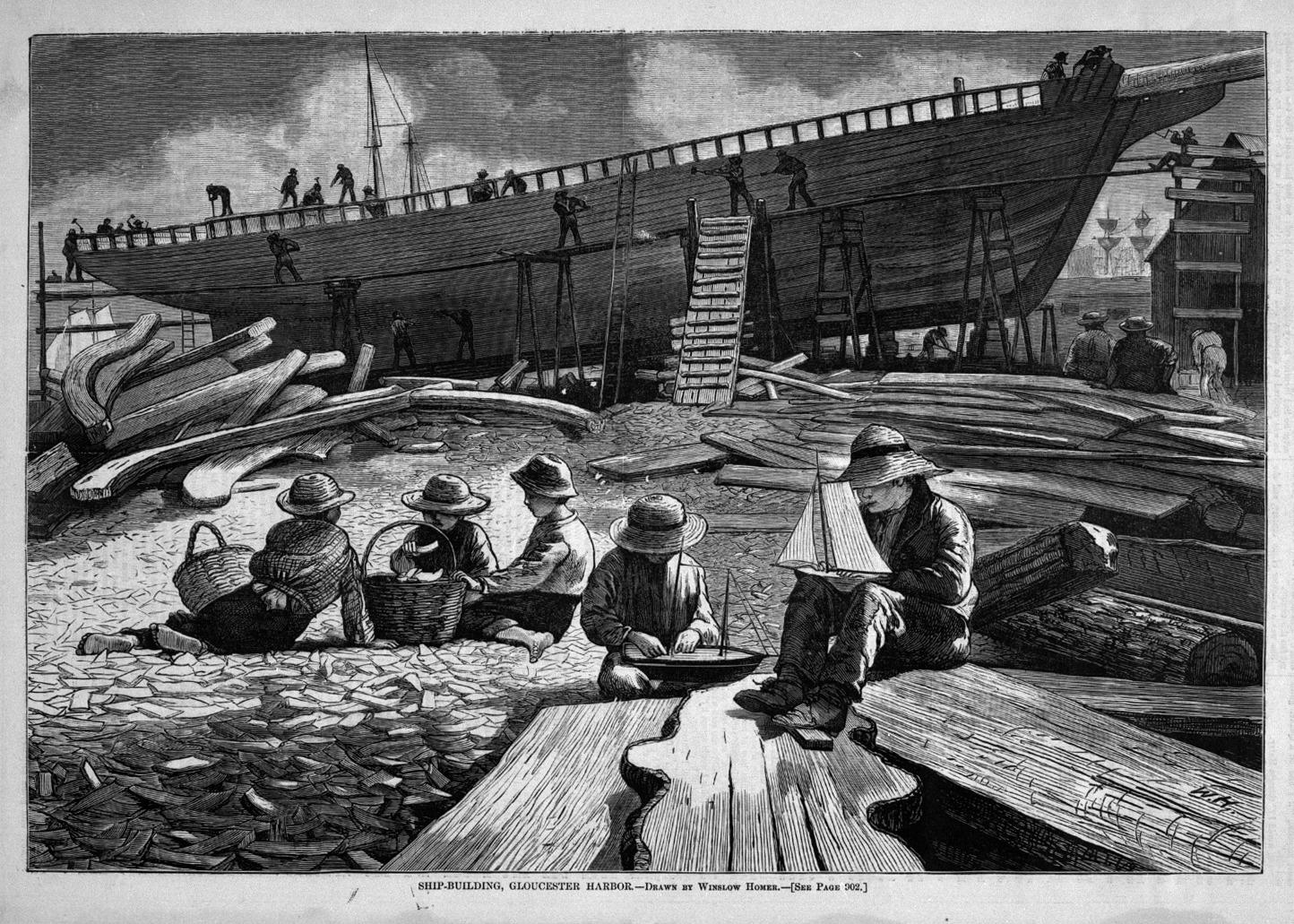 Winslow Homer (American, 1836–1910). Ship-Building, Gloucester Harbor, 1873. Wood engraving, Image: 9 3/8 x 13 5/8 in. (23.8 x 34.6 cm) Sheet: 11 1/4 x 15 5/8 in. (28.6 x 39.7 cm). Brooklyn Museum, Gift of Harvey Isbitts, 1998.105.180. (Photo: Brooklyn Museum)
