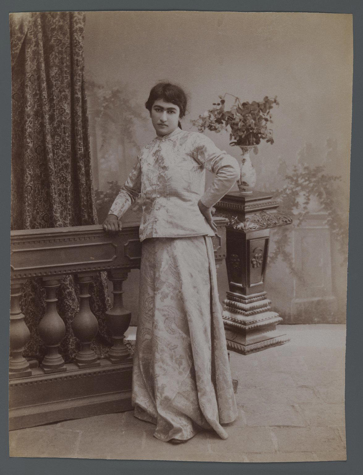 Woman in Western Costume Leaning on Balustrade, One of 274 Vintage Photographs, late 19th–early 20th century. Albumen silver photograph, 8 1/16 x 6 1/4 in. (20.5 x 15.8 cm). Brooklyn Museum, Purchase gift of Leona Soudavar in memory of Ahmad Soudavar, 1997.3.17. (Photo: Brooklyn Museum)