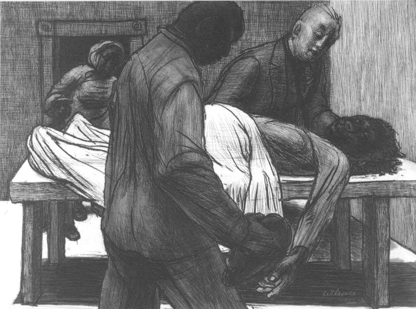 John Wilson (American, born 1922). Death of Lulu, 2001. Etching, Sheet: 11 3/4 x 15 7/8 in. (29.8 x 40.3 cm). Brooklyn Museum, Emily Winthrop Miles Fund, 2002.74.7. (Photo: Brooklyn Museum)