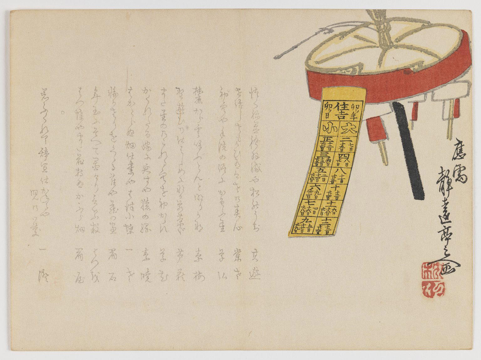 Auspicious Calendar Dates, 1867 (Year of the Hare). Woodblock print; horizontal Chûban yoko-e format, 7 1/8 x 9 3/4 in. (18.1 x 24.8 cm). Brooklyn Museum, Gift of Dr. Eleanor Z. Wallace in memory of her husband, Dr. Stanley L. Wallace, 2002.121.23. (Photo: Brooklyn Museum)