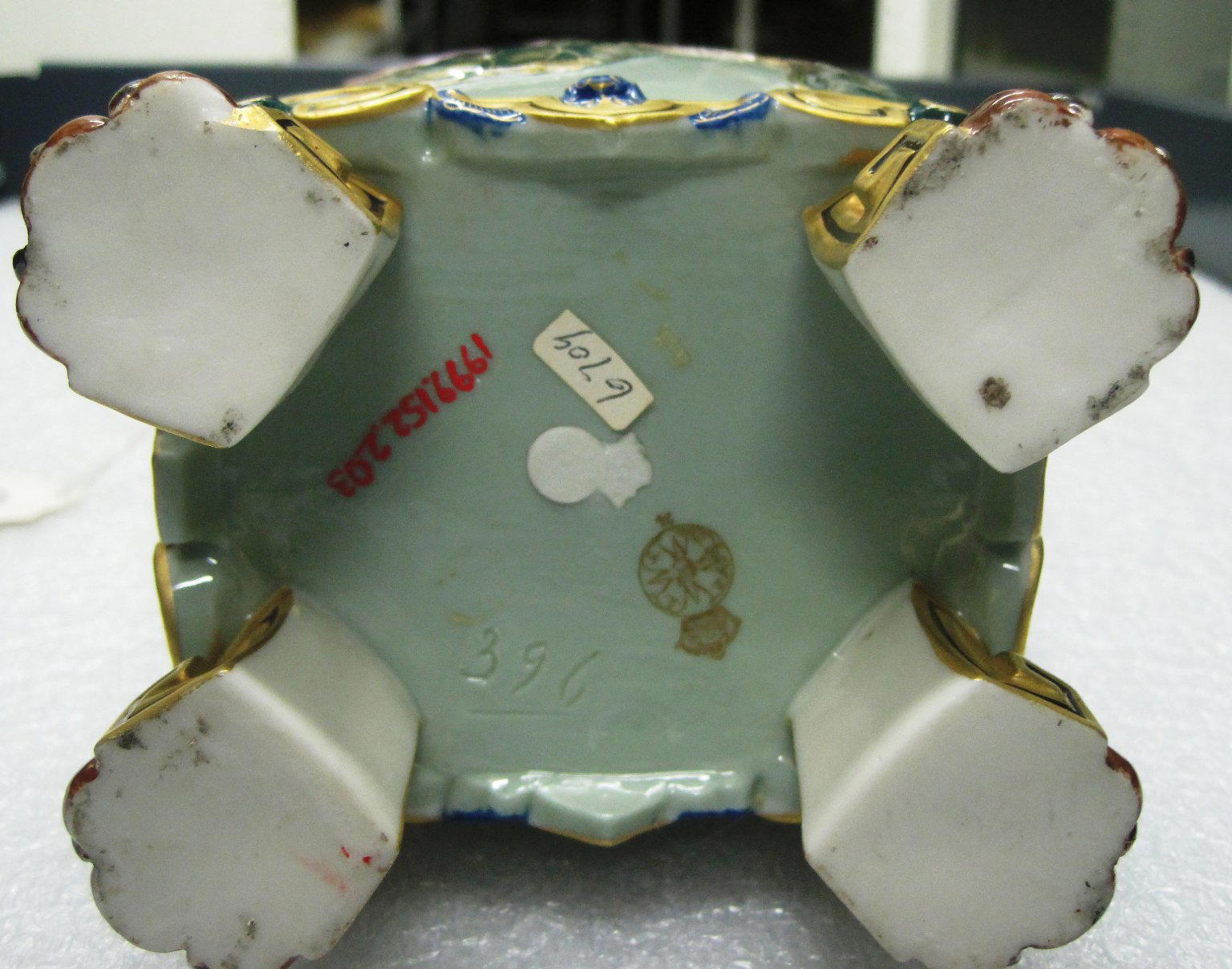 On underside, stamped, dark yellow: [Company Logo] ; etched: '396'; applied at center, white ceramic: [Company Logo] ; white paper label, in blue ink, '6709'