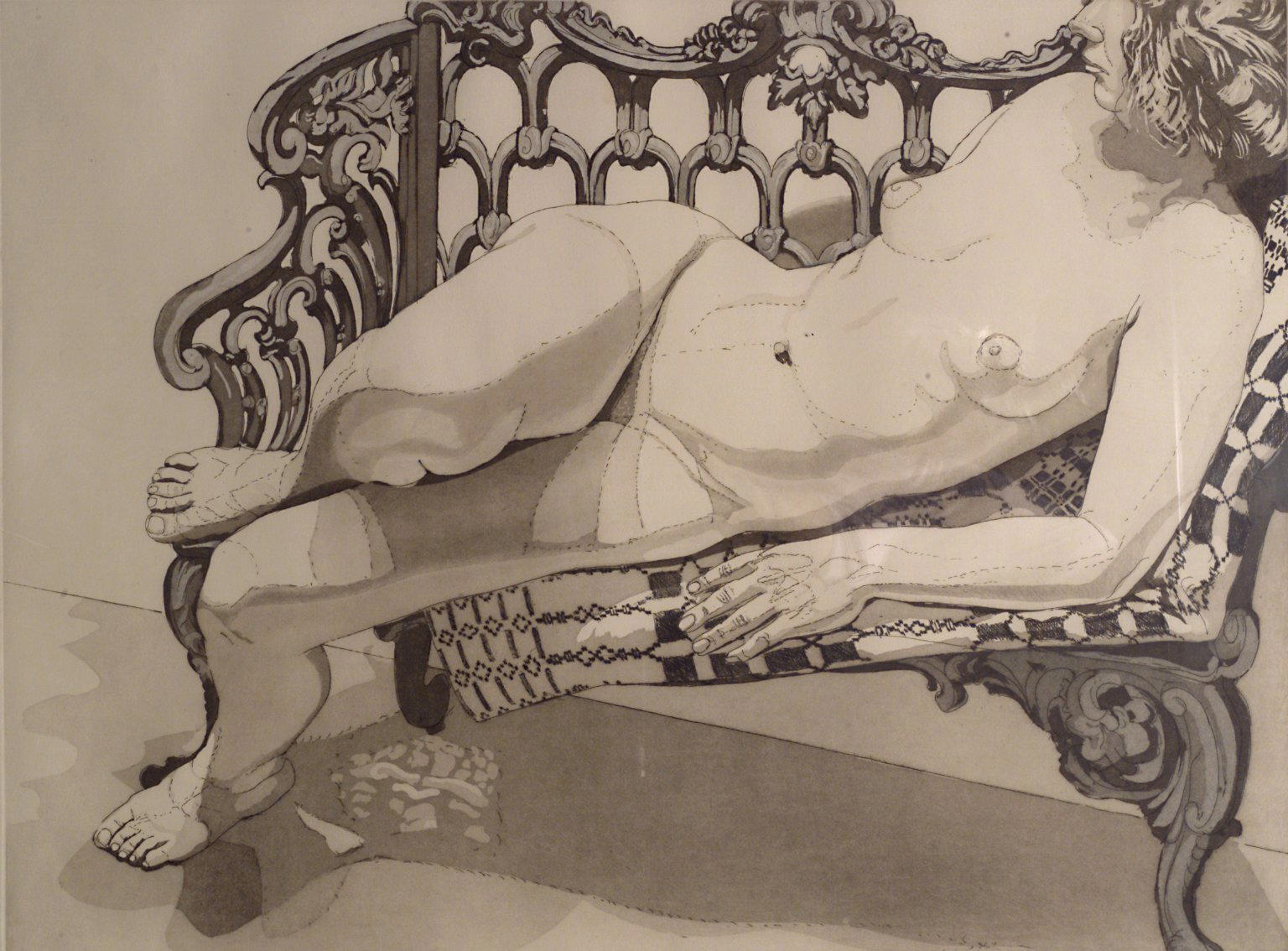 Philip Pearlstein (American, 1924–2022). Nude on a Silver Bench, 1972. Etching and aquatint, 21 3/4 x 29 3/16 in. (55.2 x 74.2 cm). Brooklyn Museum, Gift of Edward and Phyllis Kwalwasser, 2004.45.2. © Philip Pearlstein. (Photo: Brooklyn Museum)