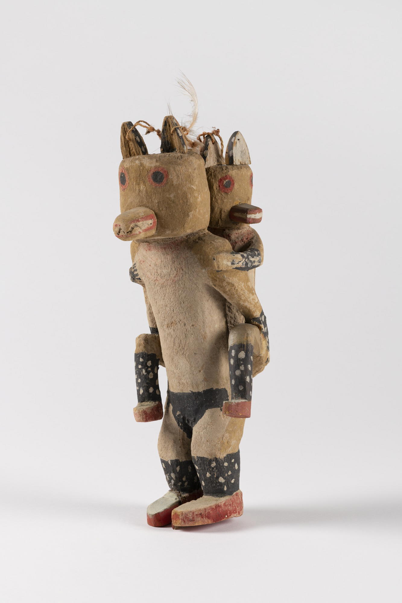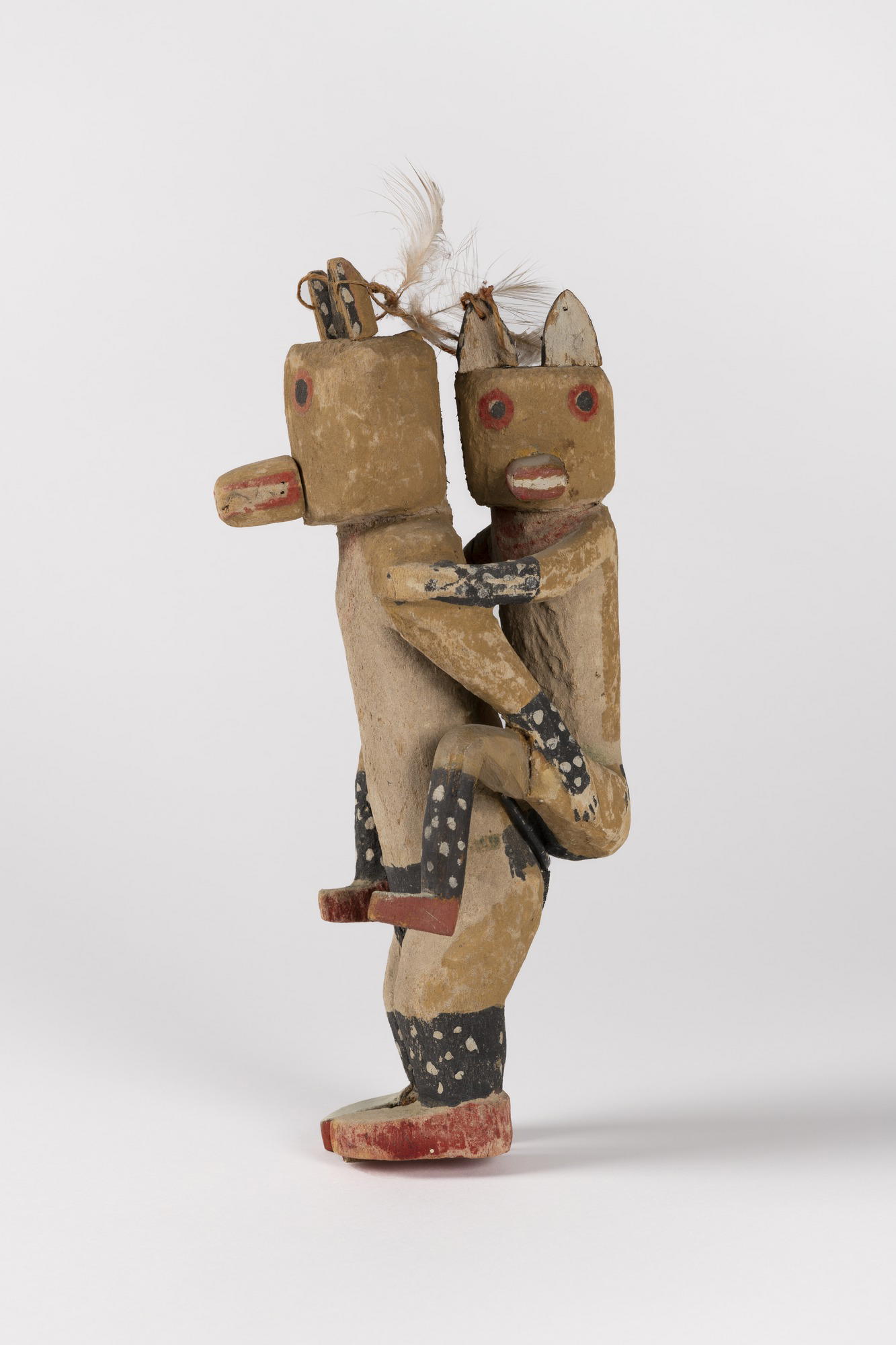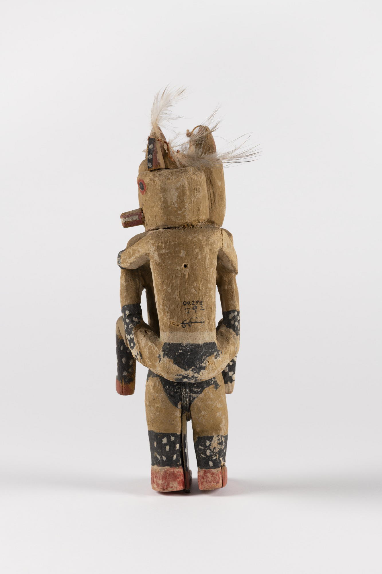 Hopi Pueblo. Kachina Doll (Kwewuu [Wolf]), late 19th century. Wood, pigment, cotton, feather, 9 3/8 × 3 1/4 × 4 3/8 in. (23.8 × 8.3 × 11.1 cm). Brooklyn Museum, Museum Expedition 1904, Museum Collection Fund, 04.297.5596. (Photo: Brooklyn Museum)