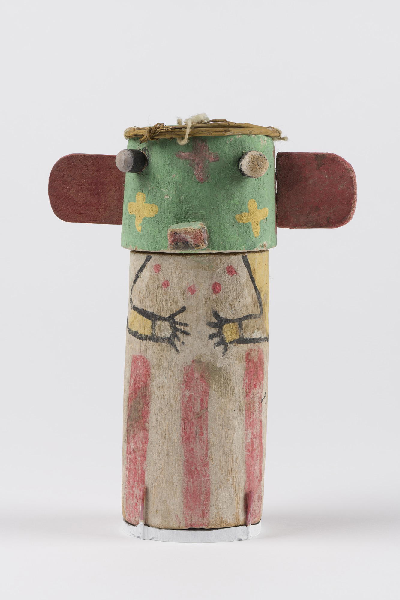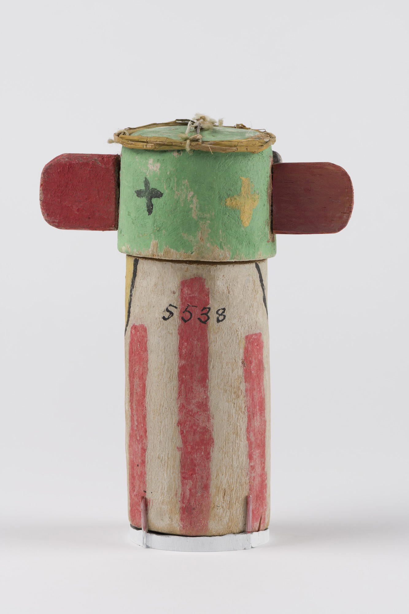 Hopi Pueblo. Kachina Doll (Omaw [Cloud]), late 19th century. Feathers, pigment, fiber, wood, 5 × 2 7/8 × 6 5/8 in. (12.7 × 7.3 × 16.8 cm) mount (2025 mount): 6 3/4 × 5 × 2 1/8 in. (17.1 × 12.7 × 5.4 cm). Brooklyn Museum, Museum Expedition 1904, Museum Collection Fund, 04.297.5538. (Photo: Brooklyn Museum)
