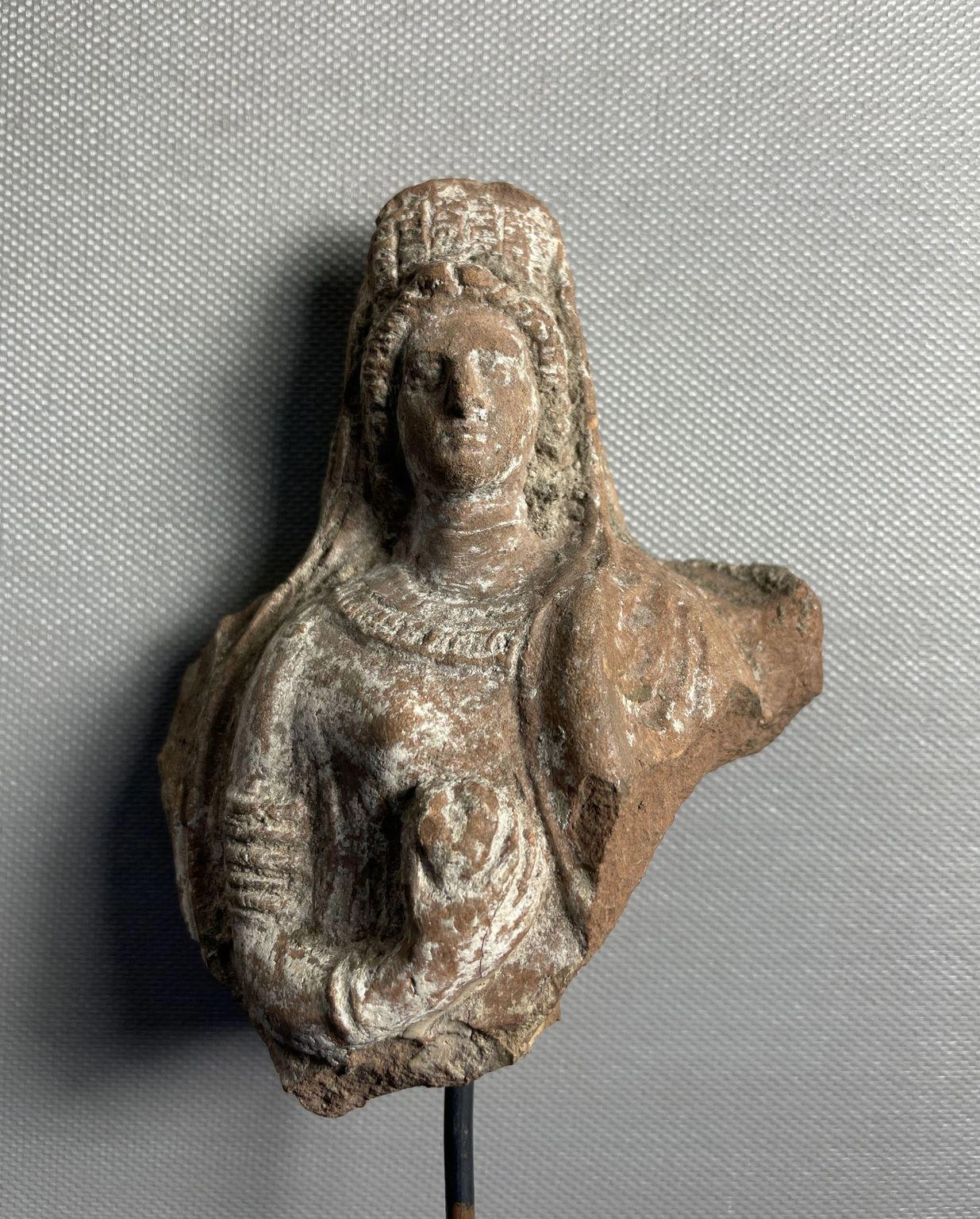 Greek; Rhodian. Head and Upper Torso of Female Figure, 5th century B.C.E. or 3rd–2nd century B.C.E.. Terracotta, slip, 4 5/16 (height without tang) × 3 5/16 × 1 5/8 in. (11 × 8.4 × 4.2 cm). Brooklyn Museum, Museum Collection Fund, 05.7. (Photo: Brooklyn Museum)