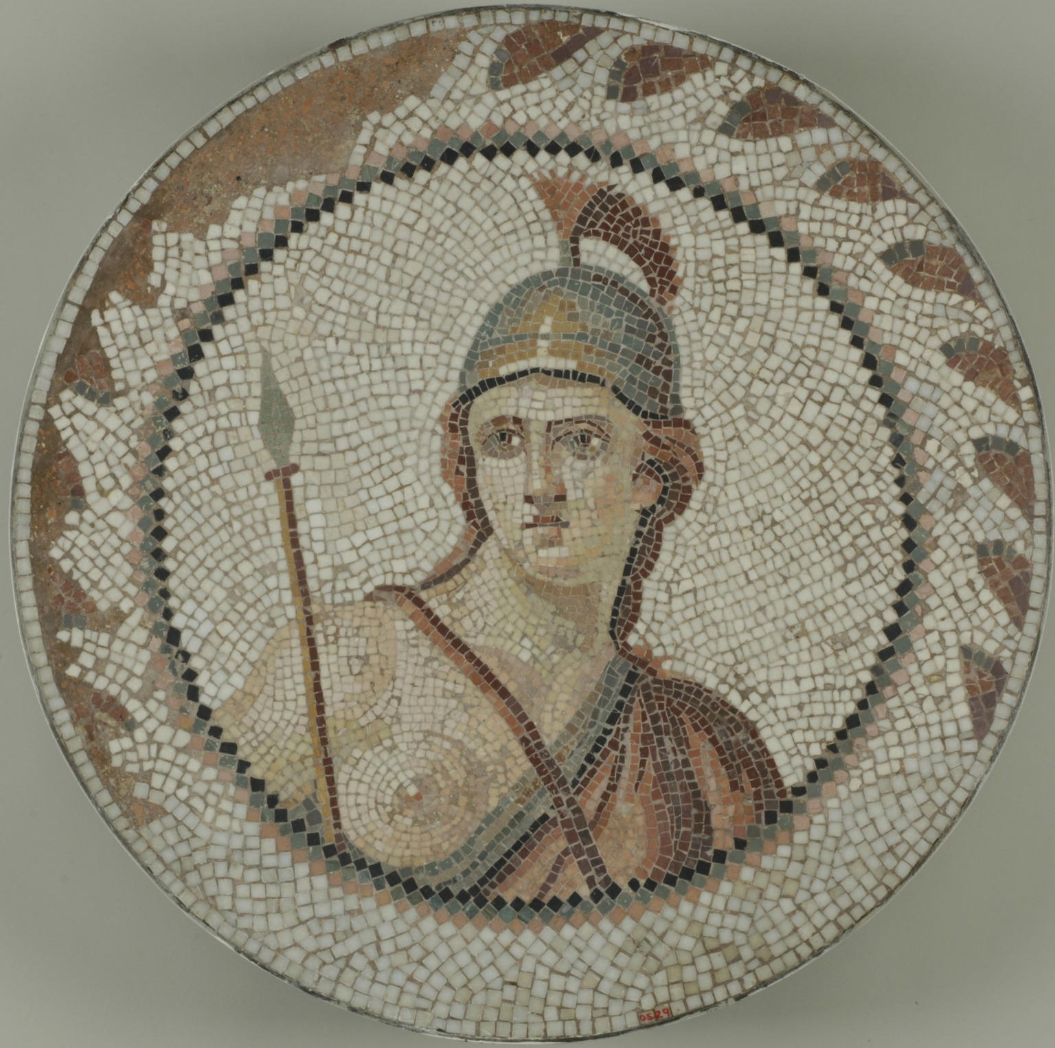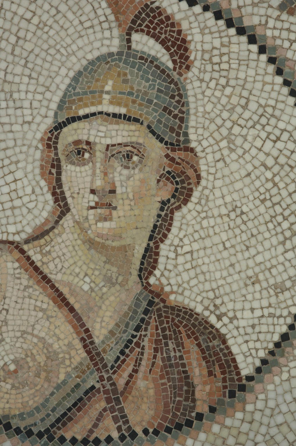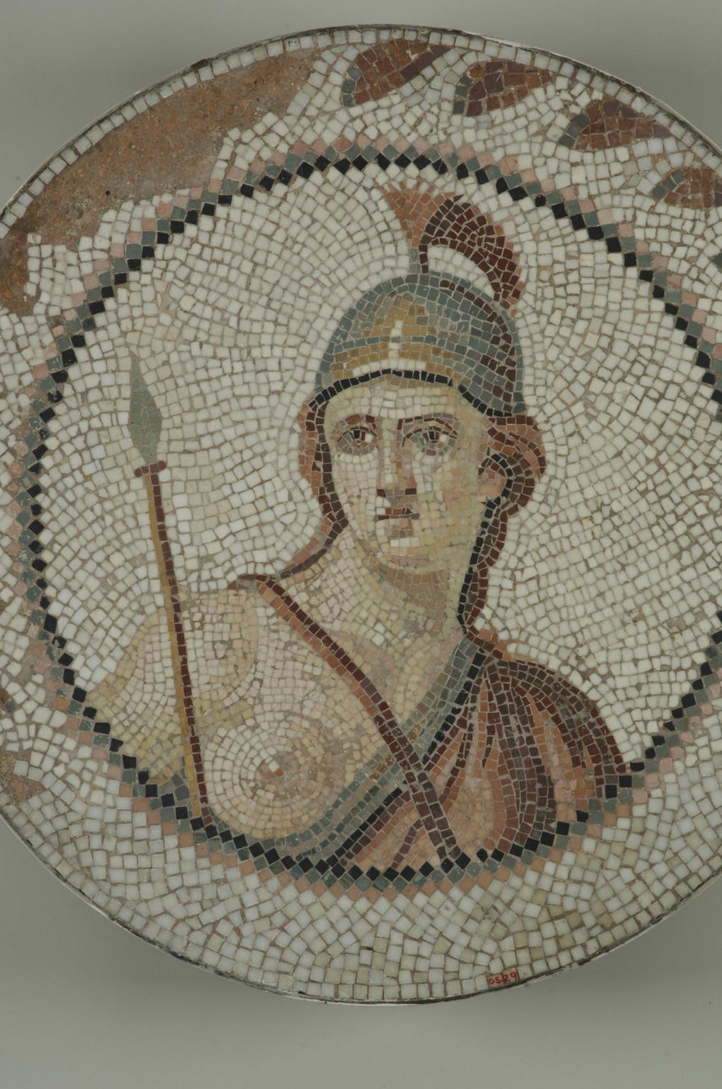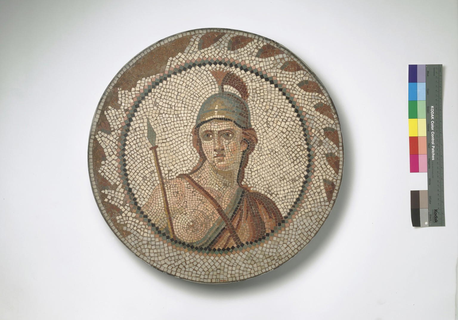 Roman. Mosaic of Personification of Roma in a Medallion, 1st–2nd century C.E.. Stone and mortar, 1 1/4 x 21 1/4 in. (3.2 x 53.9 cm) 37 lb. (16.8kg). Brooklyn Museum, Museum Collection Fund, 05.29. (Photo: Brooklyn Museum)