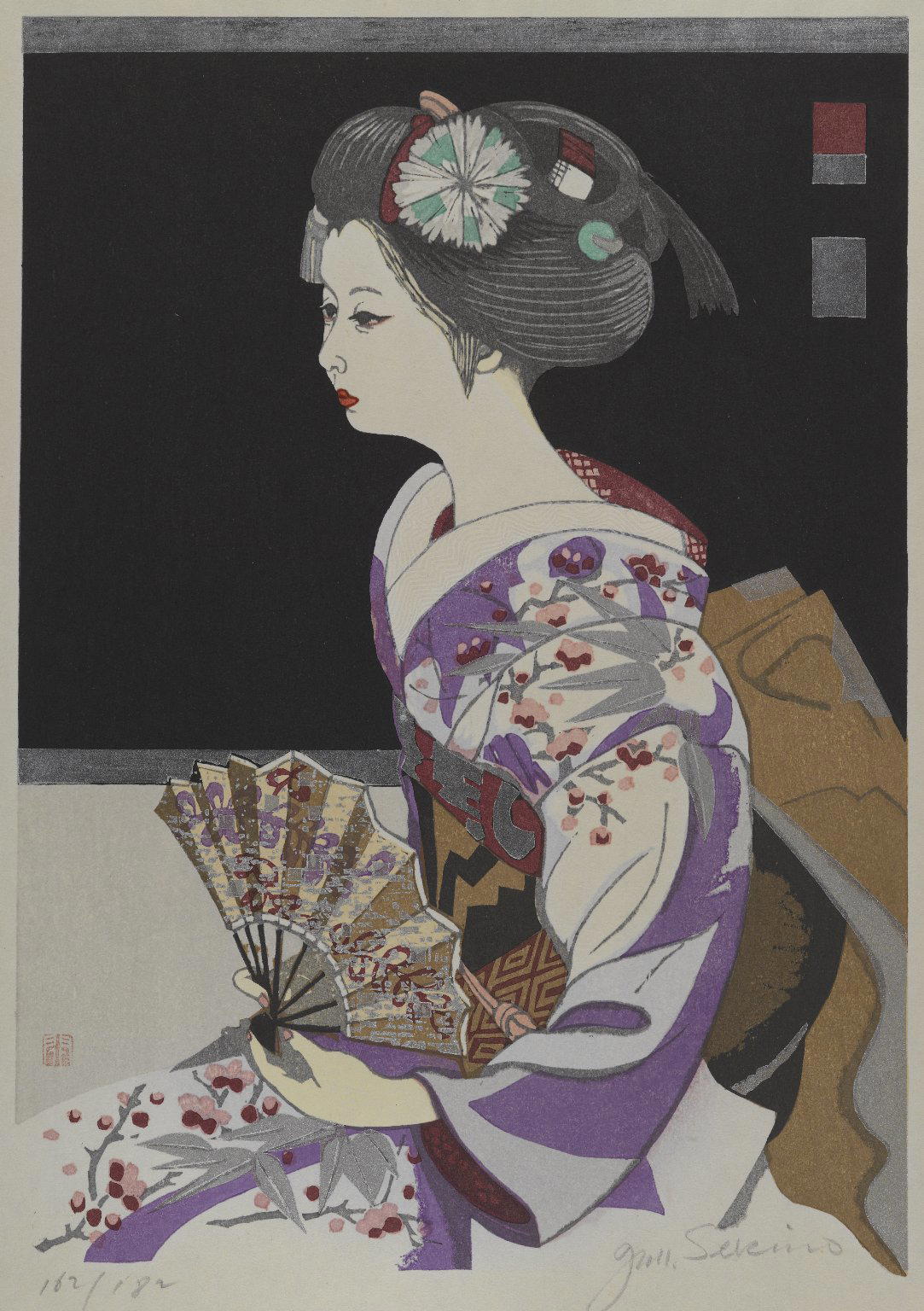 Sekino Junichiro (Japanese, 1914–1988). [Untitled] (Geisha in Profile), Woodblock print, Other (Sight): 20 3/16 x 15 in. (51.3 x 38.1 cm) Frame: 26 7/8 x 21 1/8 in. (68.3 x 53.7 cm). Brooklyn Museum, Gift of the Estate of Dr. Eleanor Z. Wallace, 2007.32.93. © Estate of Sekino Junichiro. (Photo: Brooklyn Museum)