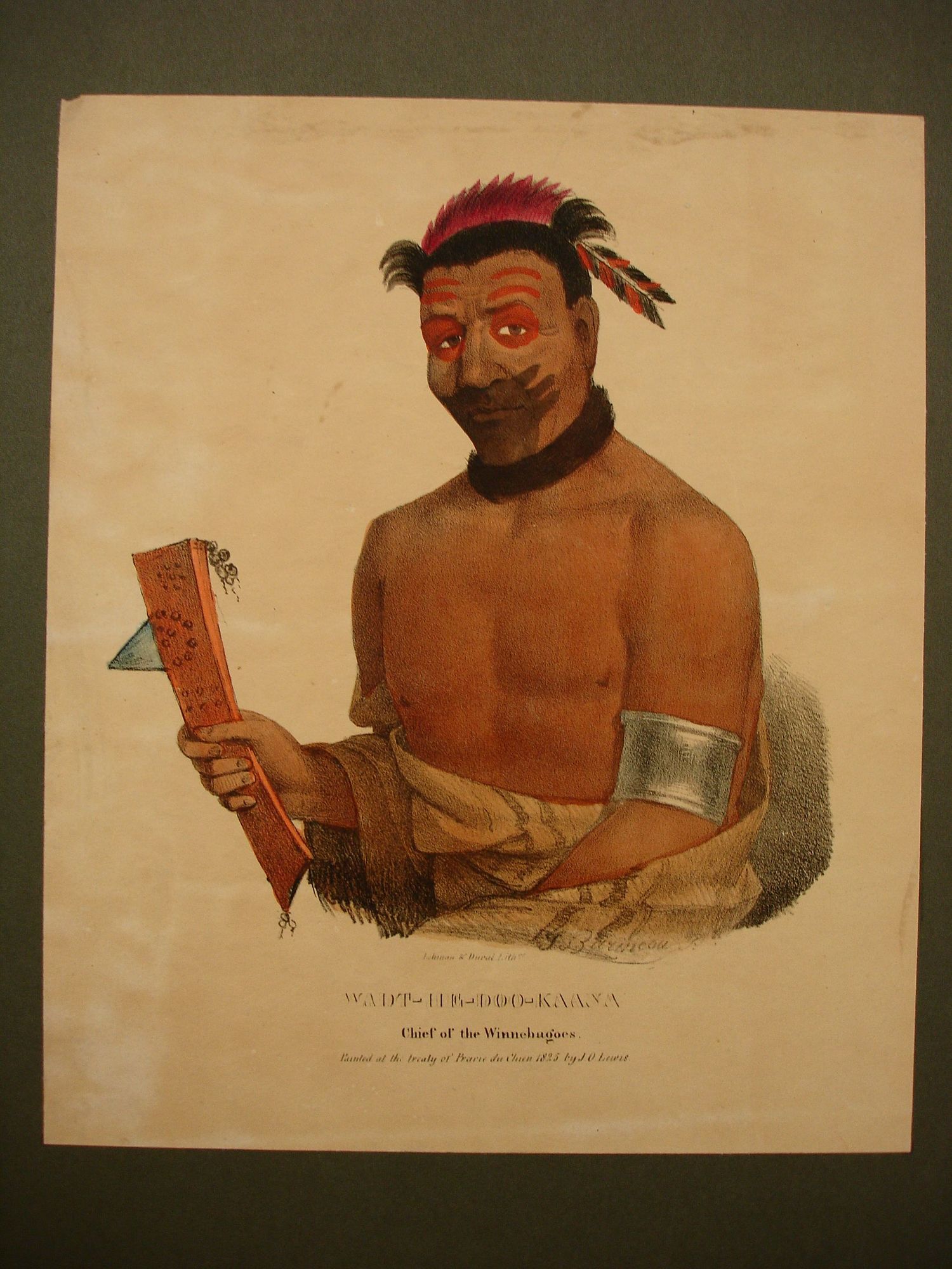 Engraved below image in center: "WADT-HE-DOO-KAANA / Chief of the Winnebagoes. / Painted at the treaty of Prarie [sic] du Chien 1825. by J. O. Lewis."