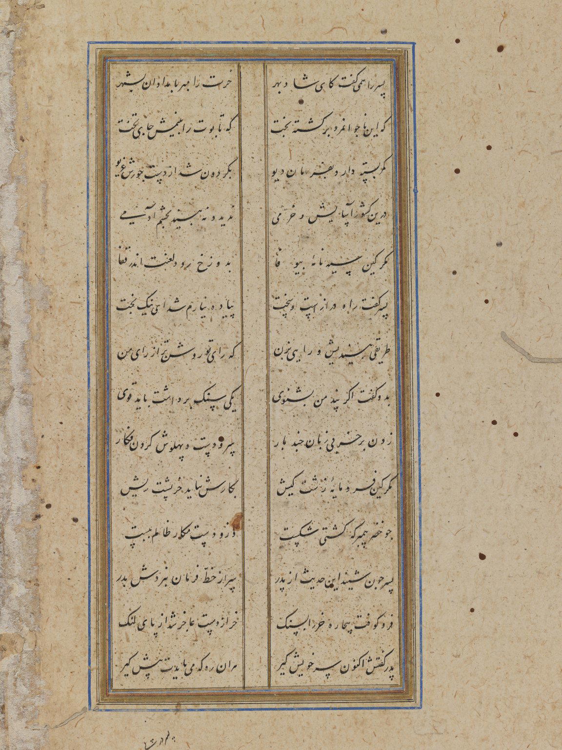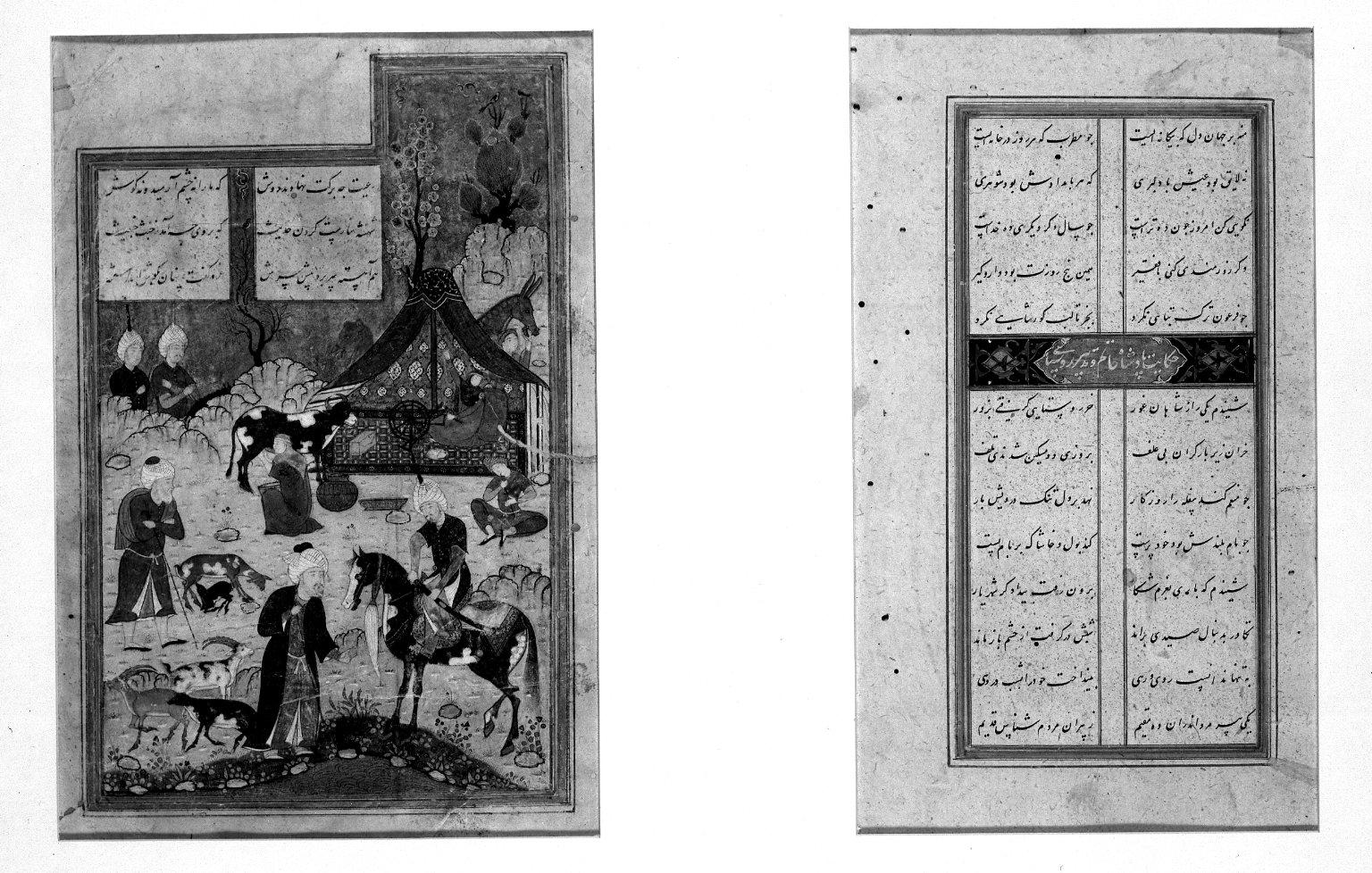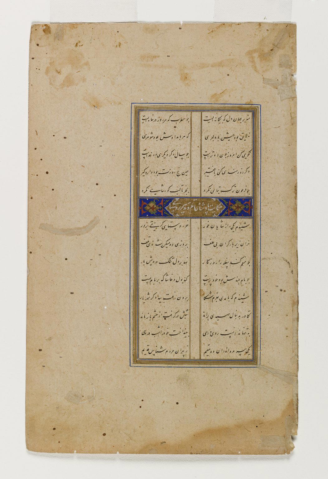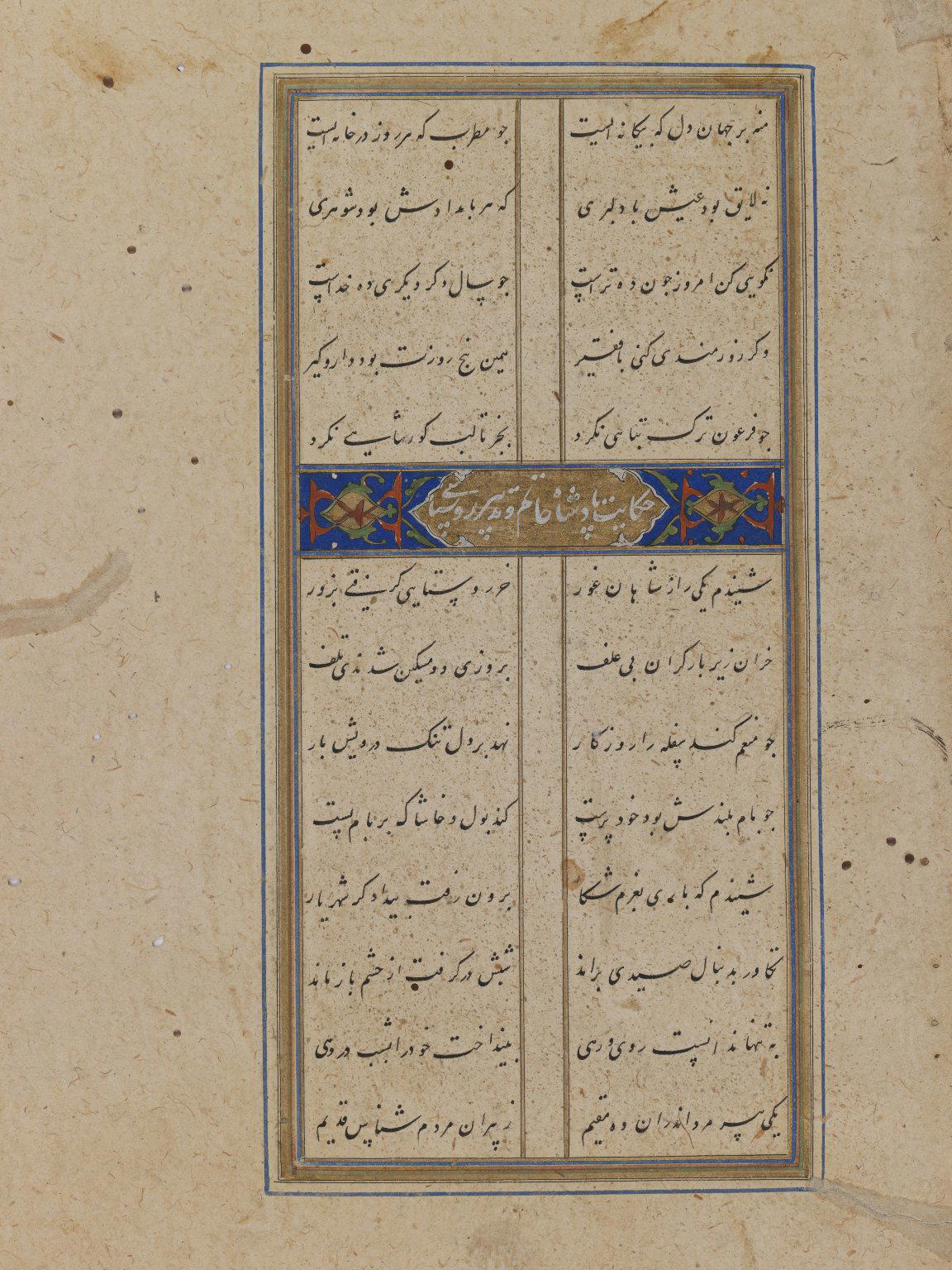 The Story of the Ghurid King and the Peasant, Page from an illustrated manuscript of the Bustan (Orchard) of Sa'di, early 16th century. Ink, opaque watercolor, and gold on paper , Whole page: 26.5 x 16 cm. Brooklyn Museum, Frank L. Babbott Fund, 35.1030.1a-b. (Photo: Brooklyn Museum)