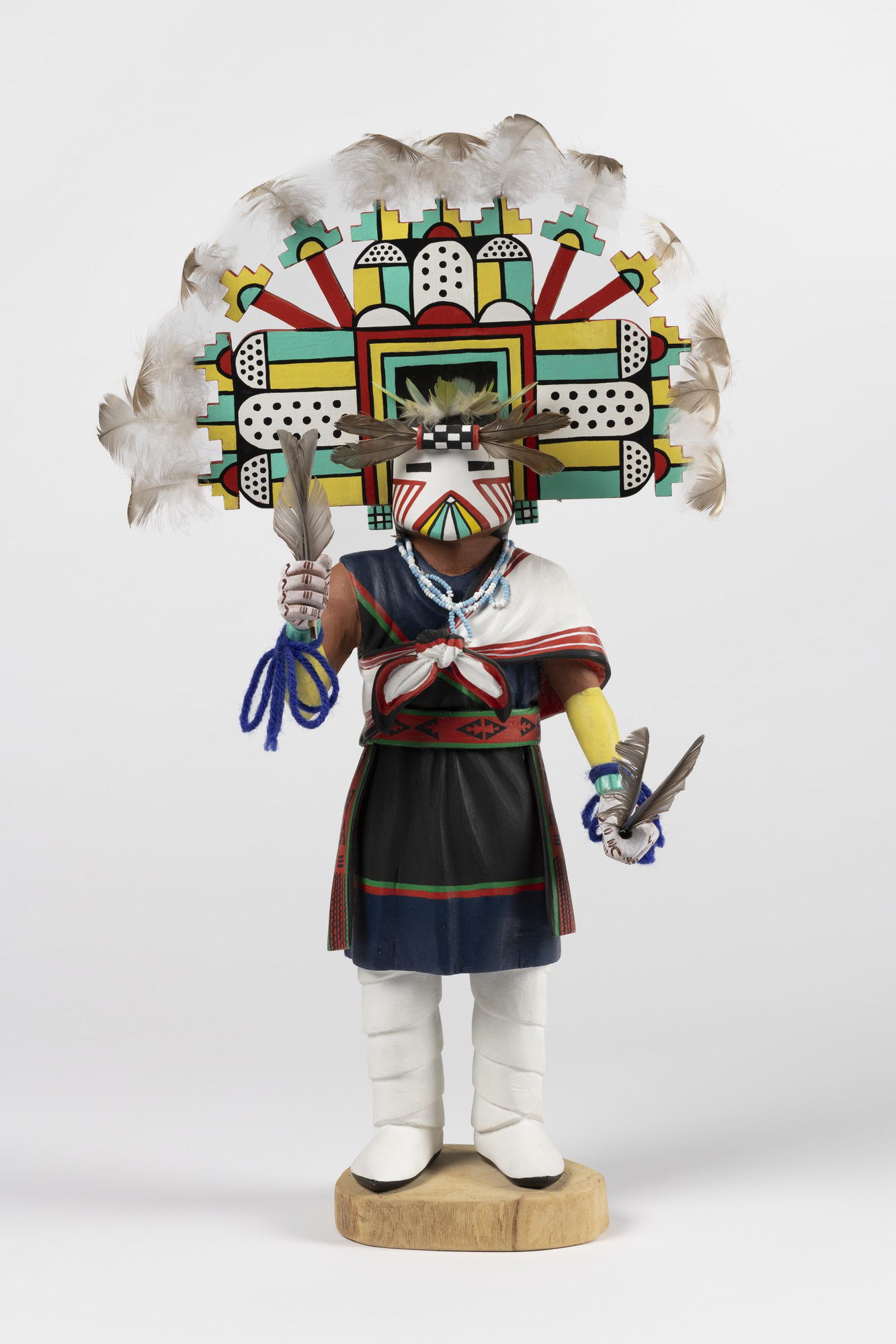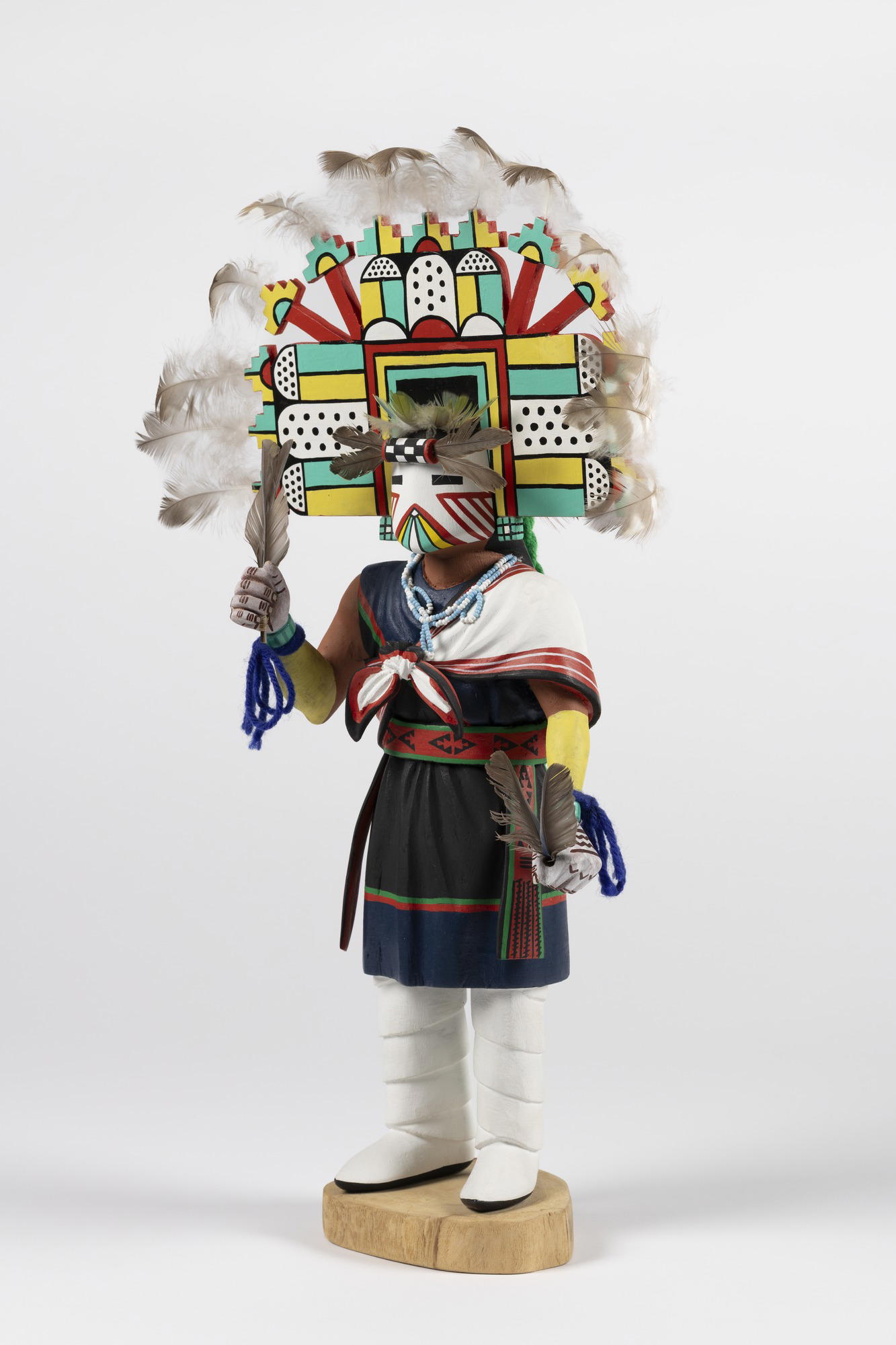 Henry Shelton (1929–2016); Pueblo, Hopi. Kachina Doll (Paalhikmana), 1960–1970. Cottonwood root, acrylic pigment, feathers, yarn, beads, 19 x 10 x 5 1/2 in. (48.3 x 25.4 x 14 cm). Brooklyn Museum, Gift of Edith and Hershel Samuels, 2010.6.6. (Photo: Brooklyn Museum)