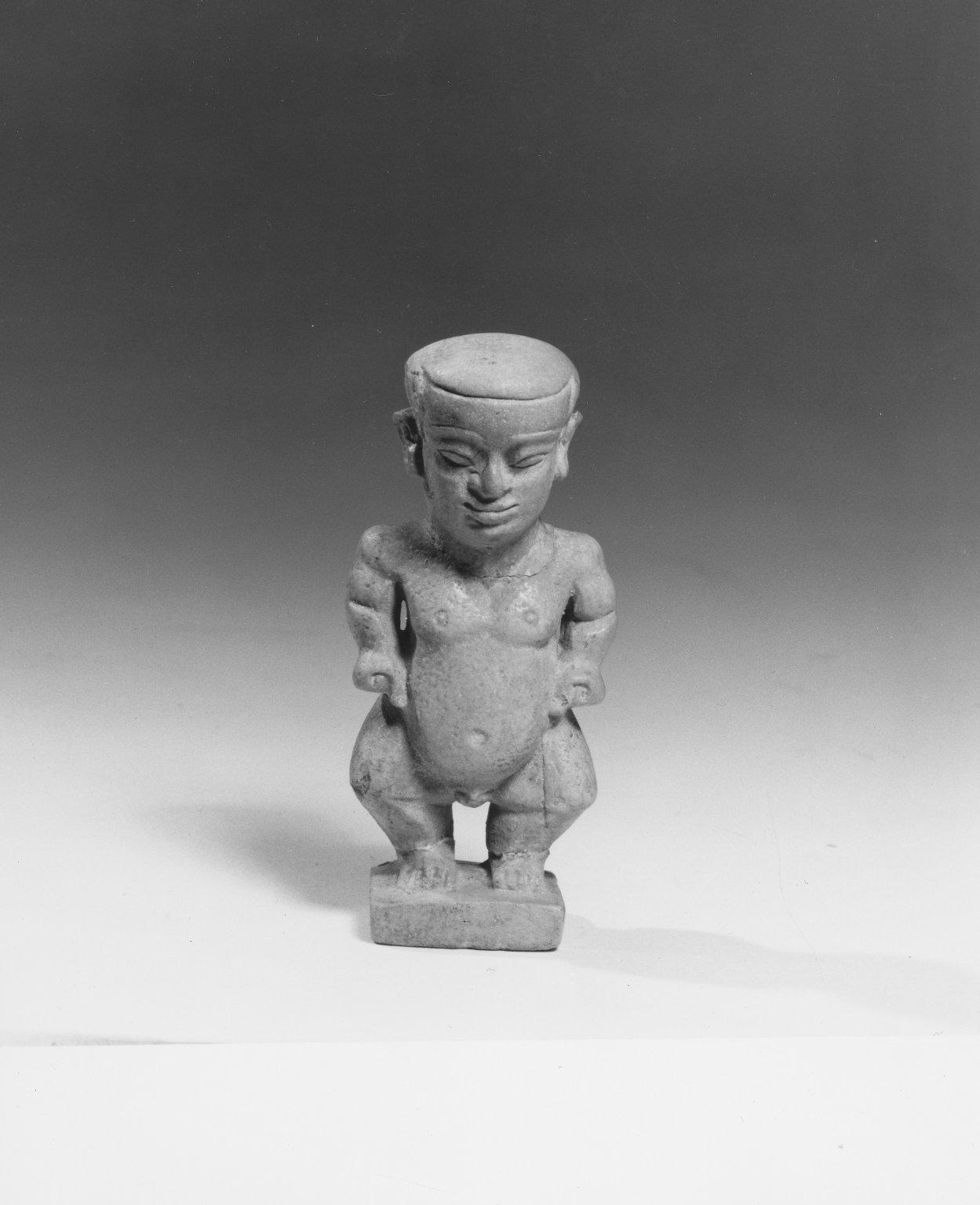 Pataikos Amulet, ca. 1075–656 B.C.E.. Faience, 3 × 1 3/8 × 15/16 in. (7.6 × 3.5 × 2.4 cm). Brooklyn Museum, Charles Edwin Wilbour Fund, 08.480.137. (Photo: Brooklyn Museum)