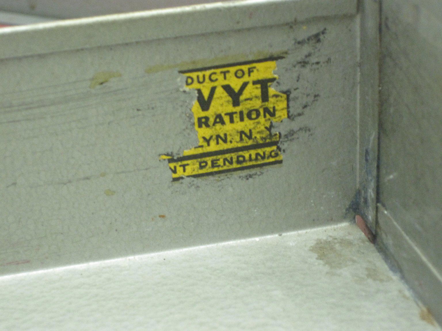 Remant of printed label on inside of drawer, black lettering on yellow ground: "[PRO]DUCT OF/ ...W]YT.../ [CORPO]RATION/ [BROOK]LYN, N. Y./ [PATE]NT PENDING" [Lewyt Corp.- see Historical Attribution]