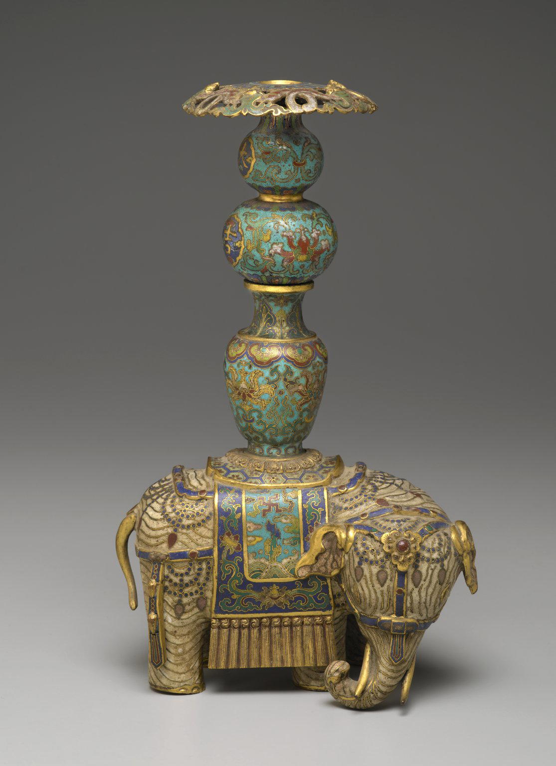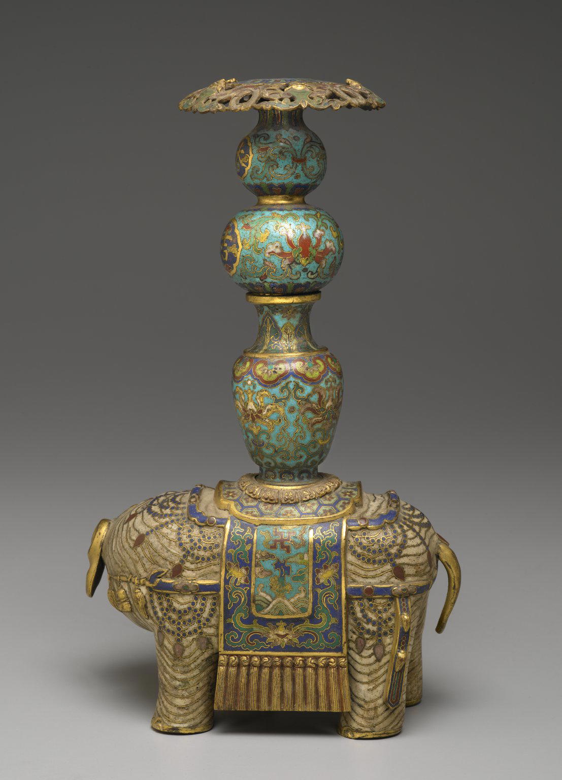 Figure of an Elephant with Two Miniature Vases, 18th century. Cloisonné enamel on copper alloy, 12 x 7 x 4 1/2 in. (30.5 x 17.8 x 11.4 cm) elephant: 5 x 7 x 4 1/2 in. (12.7 x 17.8 x 11.4 cm). Brooklyn Museum, Gift of Samuel P. Avery, 09.633a-c. (Photo: Brooklyn Museum)