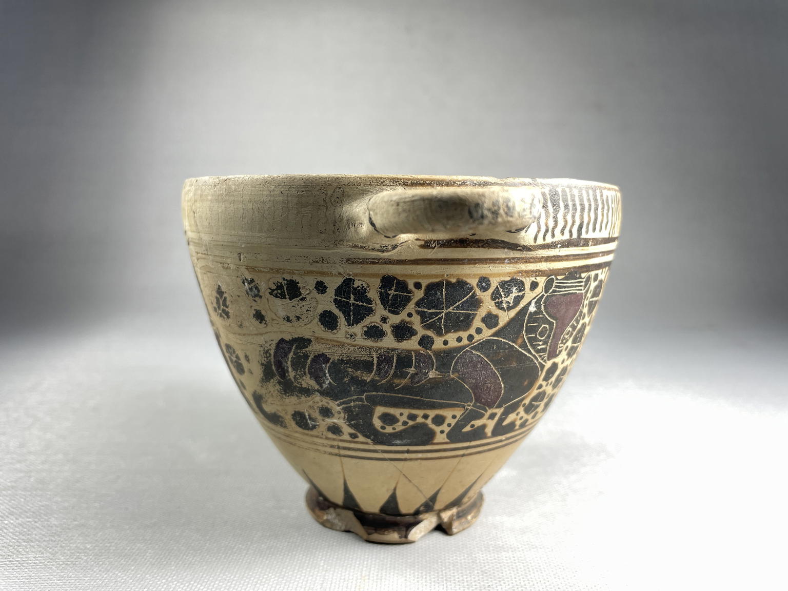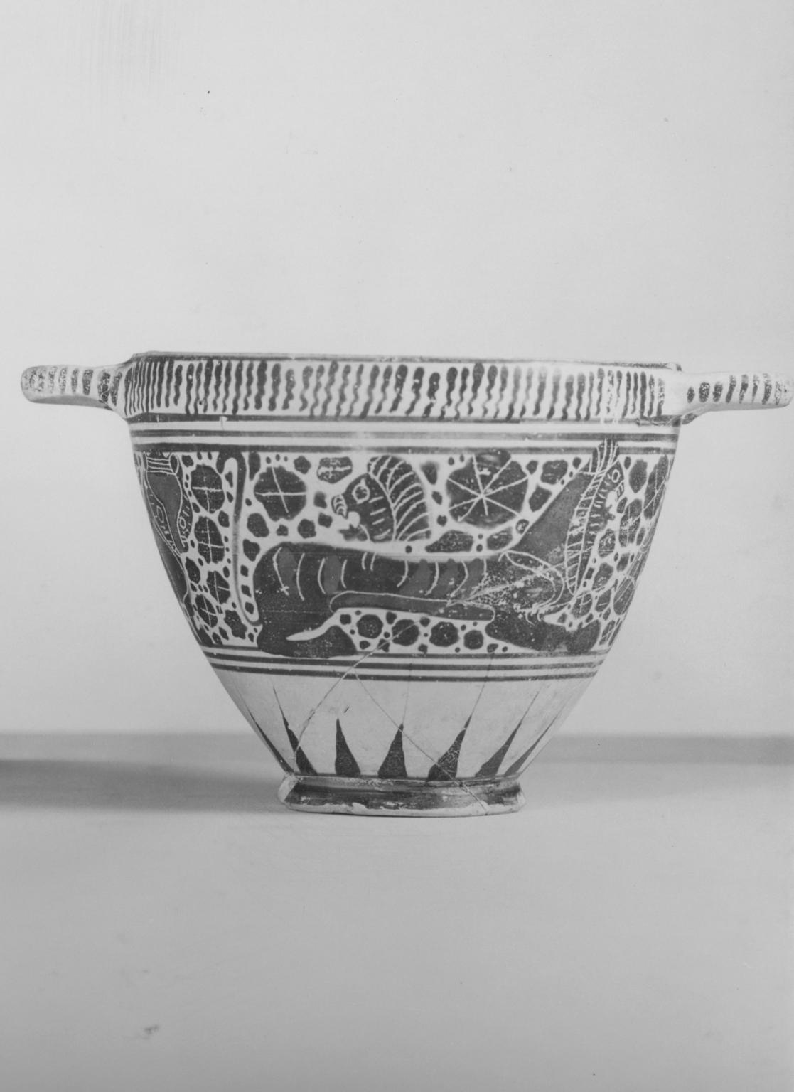 Greek; Corinthian. Skyphos or Kotyle, 6th century B.C.E.. Clay, slip, 3 15/16 × 4 5/8 × 7 5/16 in. (10 × 11.8 × 18.5 cm). Brooklyn Museum, Gift of Robert B. Woodward, 09.875. (Photo: Brooklyn Museum)