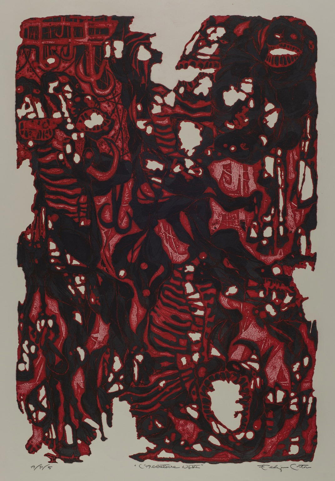 Eldzier Cortor (American, 1916–2015). L'Abbatoire VI, 1980. Etching, 41 3/4 x 29 1/2 in. (106 x 74.9 cm). Brooklyn Museum, Gift of Eldzier Cortor in memory of Sophia Cortor, 2012.81.9. © Eldzier Cortor. (Photo: Brooklyn Museum)
