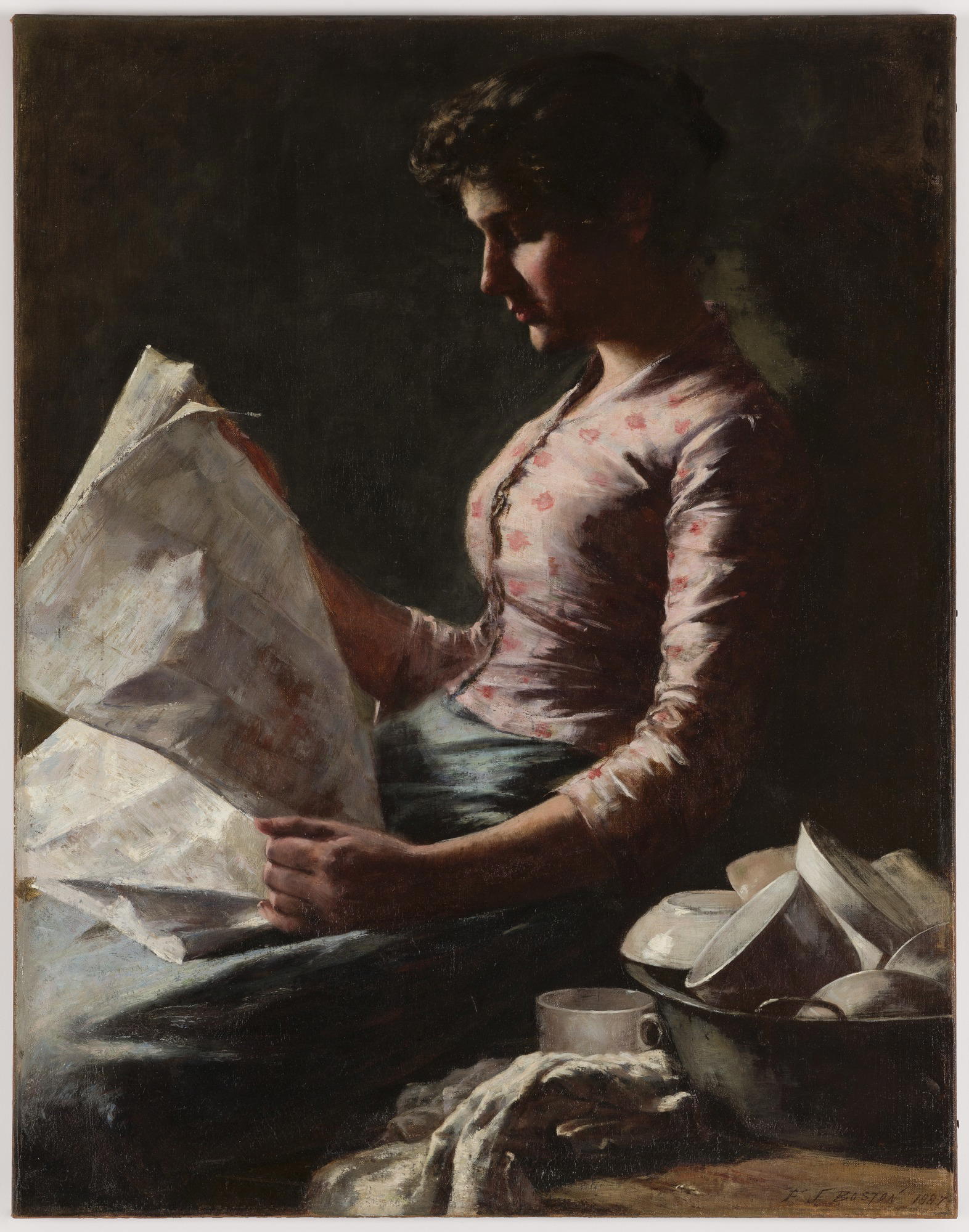 Who wouldn’t prefer a newspaper to dirty dishes? Paintings of women reading newspapers were rare in the 1880s, and those featuring working-class mothers or maids even rarer. With few exceptions, newspapers were still the purview of men.