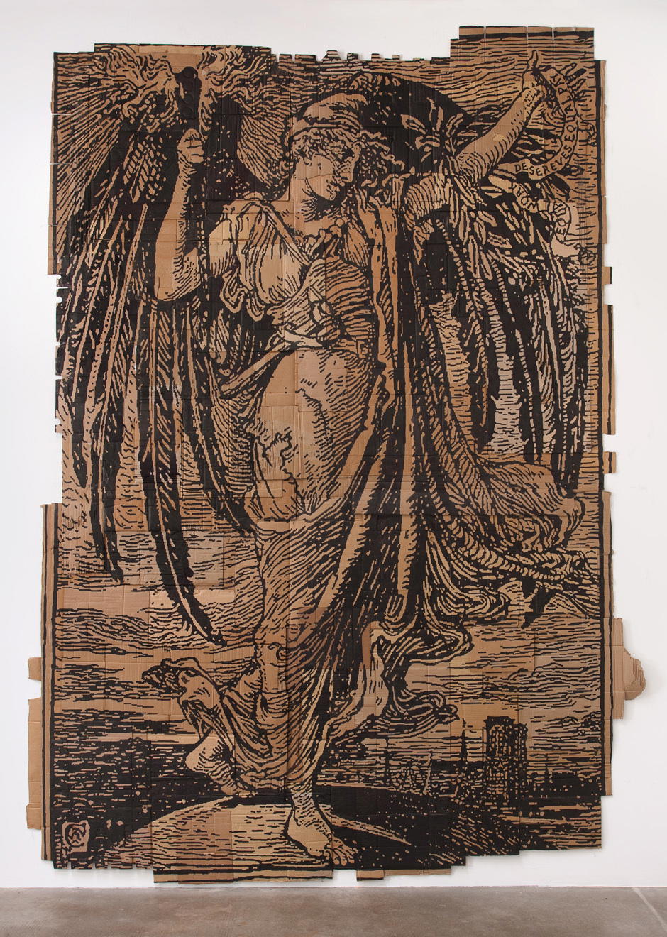 Andrea Bowers (American, born 1965). Memory of the Paris Commune Revised to Equal Work Deserves Equal Pay (Illustration by Walter Crane), 2013. Marker on cardboard, overall: 164 × 117 in. (416.6 × 297.2 cm) sheet (panel "a"): 93 1/2 × 53 × 2 1/4 in. (237.5 × 134.6 × 5.7 cm) sheet (panel "b"): 93 1/2 × 61 1/4 × 2 in. (237.5 × 155.6 × 5.1 cm) sheet (panel "c"): 78 × 72 1/2 × 2 1/4 in. (198.1 × 184.2 × 5.7 cm) sheet (panel "d"): 71 × 57 1/2 × 3 1/4 in. (180.3 × 146.1 × 8.3 cm). Brooklyn Museum, Alfred T. White Fund, Emily Winthrop Miles Fund, and Robert A. Levinson Fund, 2014.84a-d. © Andrea Bowers. (Photo: Brooklyn Museum)