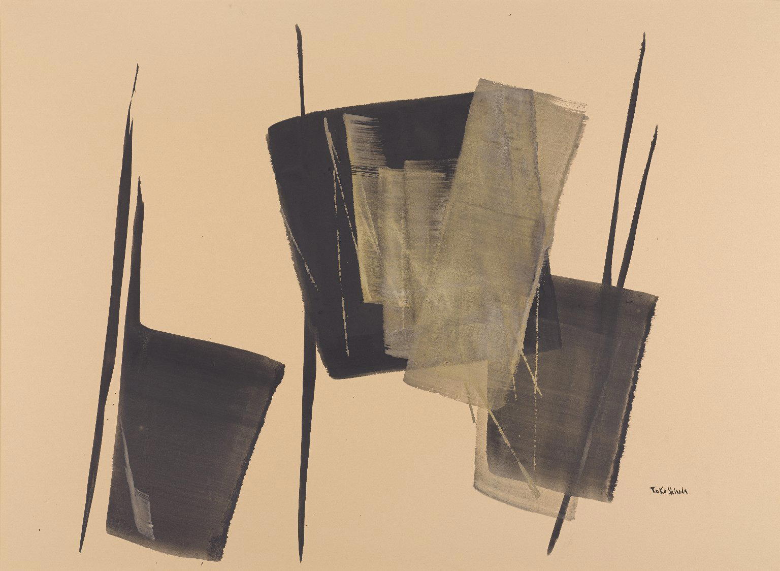 Toko Shinoda (Japanese, 1913–2021). Fugue, 1982. Silver and Sumi ink on paper mounted on wood panel, 21 x 30 in. (53.3 x 76.2 cm). Brooklyn Museum, Gift of Allison Tolman in honor of Dr. Susan L. Beningson, 2014.81. © Toko Shinoda. (Photo: Brooklyn Museum)