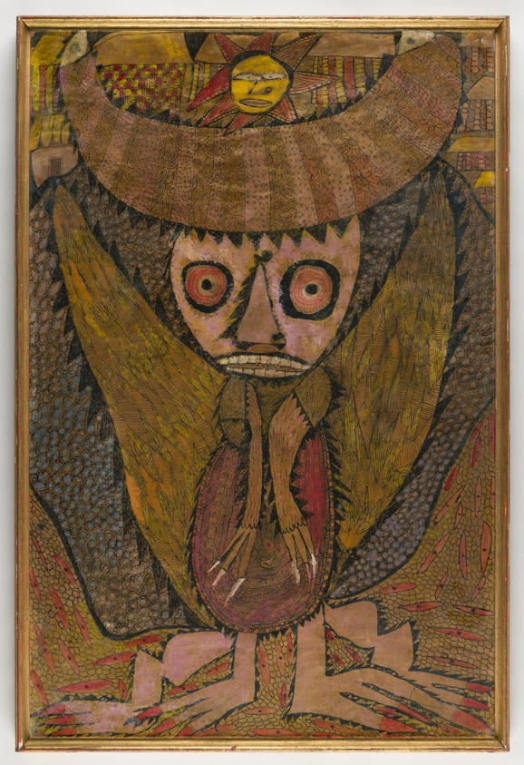 Twins Seven Seven (Nigerian, 1944 – 2011). I am a wonderful bad creature – who is half human-half bird, I’m so bad so bold so brave that I am eating together with witches says “seni” anti-bird ghost in Ibeme Town., Ink and paint on plywood Glazing: Glass, overall: 30 1/2 x 20 1/2 x 1 3/8 in. (77.5 x 52.1 x 3.5 cm). Brooklyn Museum, Gift of Donald and Pingree Louchheim, 2022.56.1. (Photo: Brooklyn Museum)