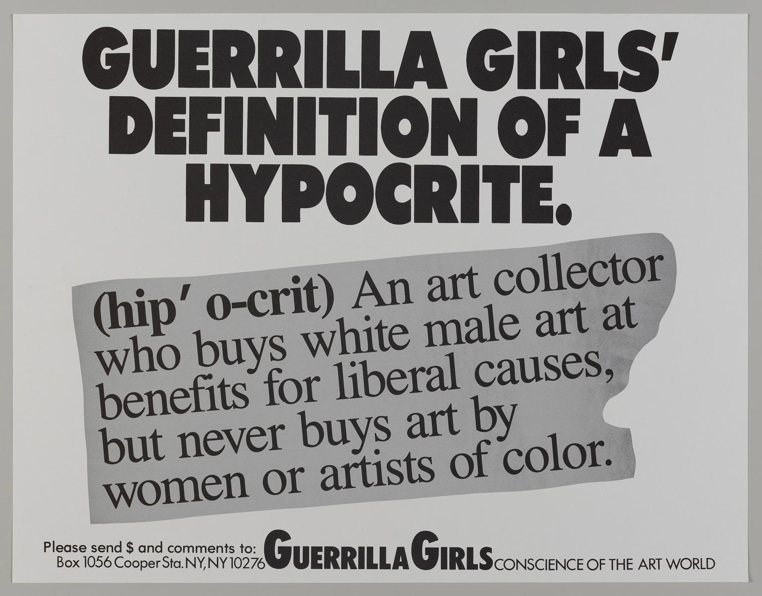 Guerrilla Girls (established United States, 1985). Guerrilla Girls' Definition of a Hypocrite, 1990. Offset lithograph, 17 × 22 in. (43.2 × 55.9 cm). Brooklyn Museum, Gift of Guerrilla Girls BroadBand, Inc., 2017.26.19. (Photo: Brooklyn Museum)