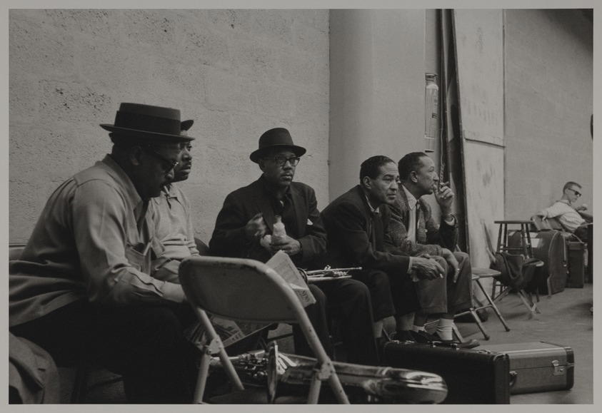 Milt Hinton (born Vicksburg Mississippi, active Chicago, IL, 1910–2000). Ben Webster, Count Basie, Roy Eldridge, Dickie Wells, Doc Cheatham, Gerry Mulligan, television studio, (Sound of Jazz rehearsal), N.Y.C., 1957. Gelatin silver print, 11 × 14 in. (27.9 × 35.6 cm). Brooklyn Museum, Gift of David G. Berger and Holly Maxson, 2023.80.17. (Photo: Brooklyn Museum)