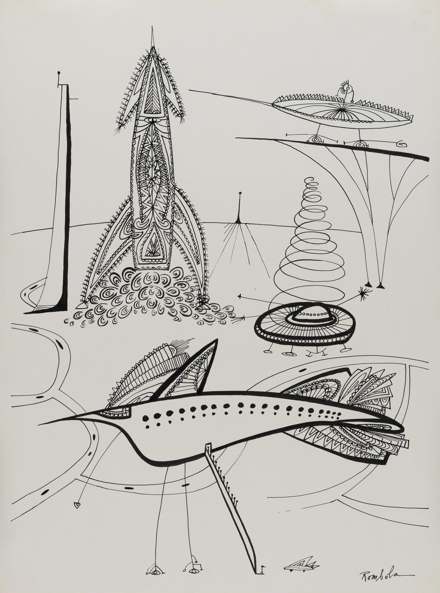 John Rombola (American, born 1933). Outer Space Airport, 1967. Ink on paper, 24 1/2 × 18 in. (62.2 × 45.7 cm). Brooklyn Museum, Gift of John Rombola, Artist, 2021.49.8. (Photo: Brooklyn Museum)