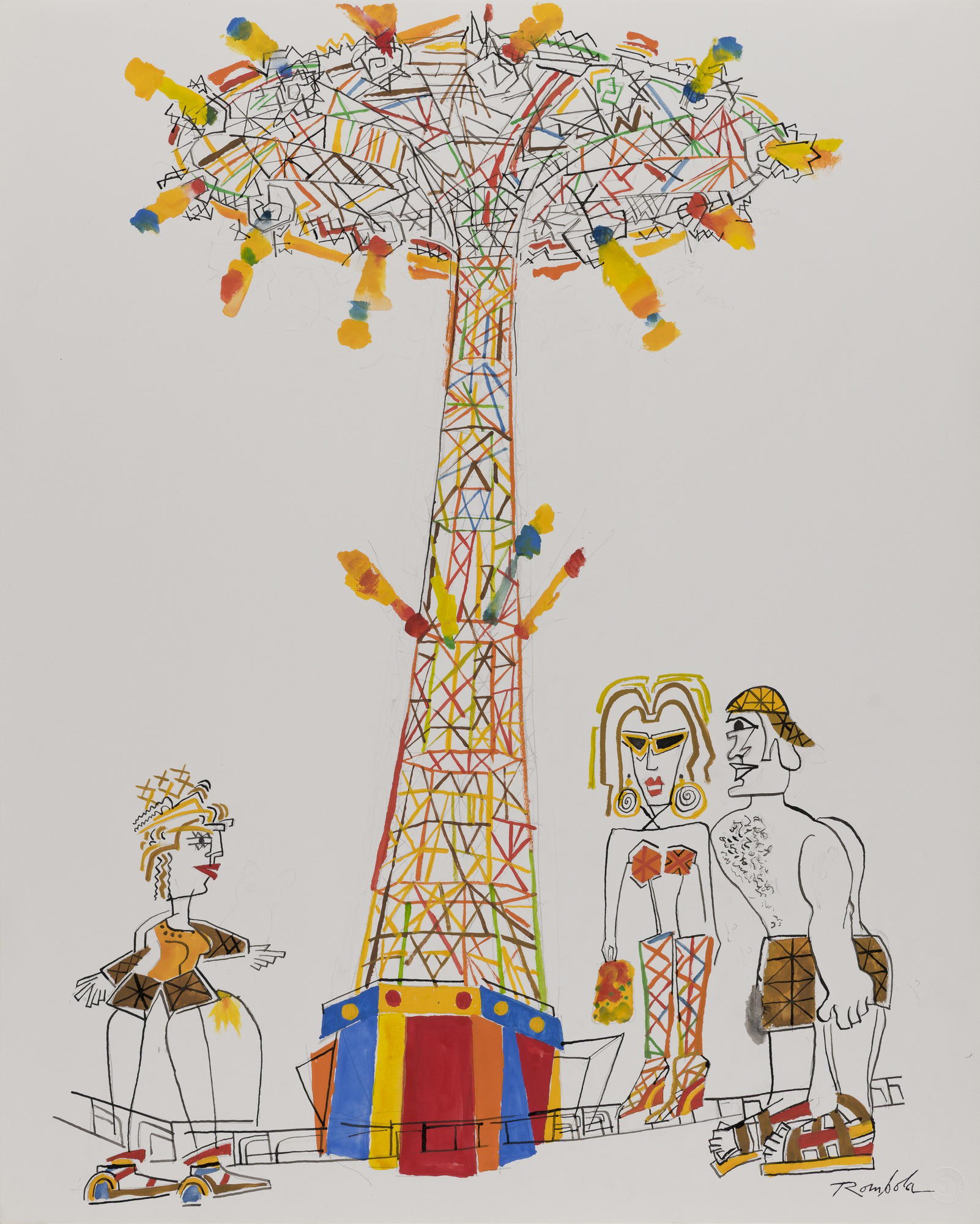 John Rombola (American, born 1933). Parachute Jump, 2005. Gouache and ink on paper, 29 × 23 in. (73.7 × 58.4 cm). Brooklyn Museum, Gift of John Rombola, Artist, 2021.49.10. (Photo: Brooklyn Museum)