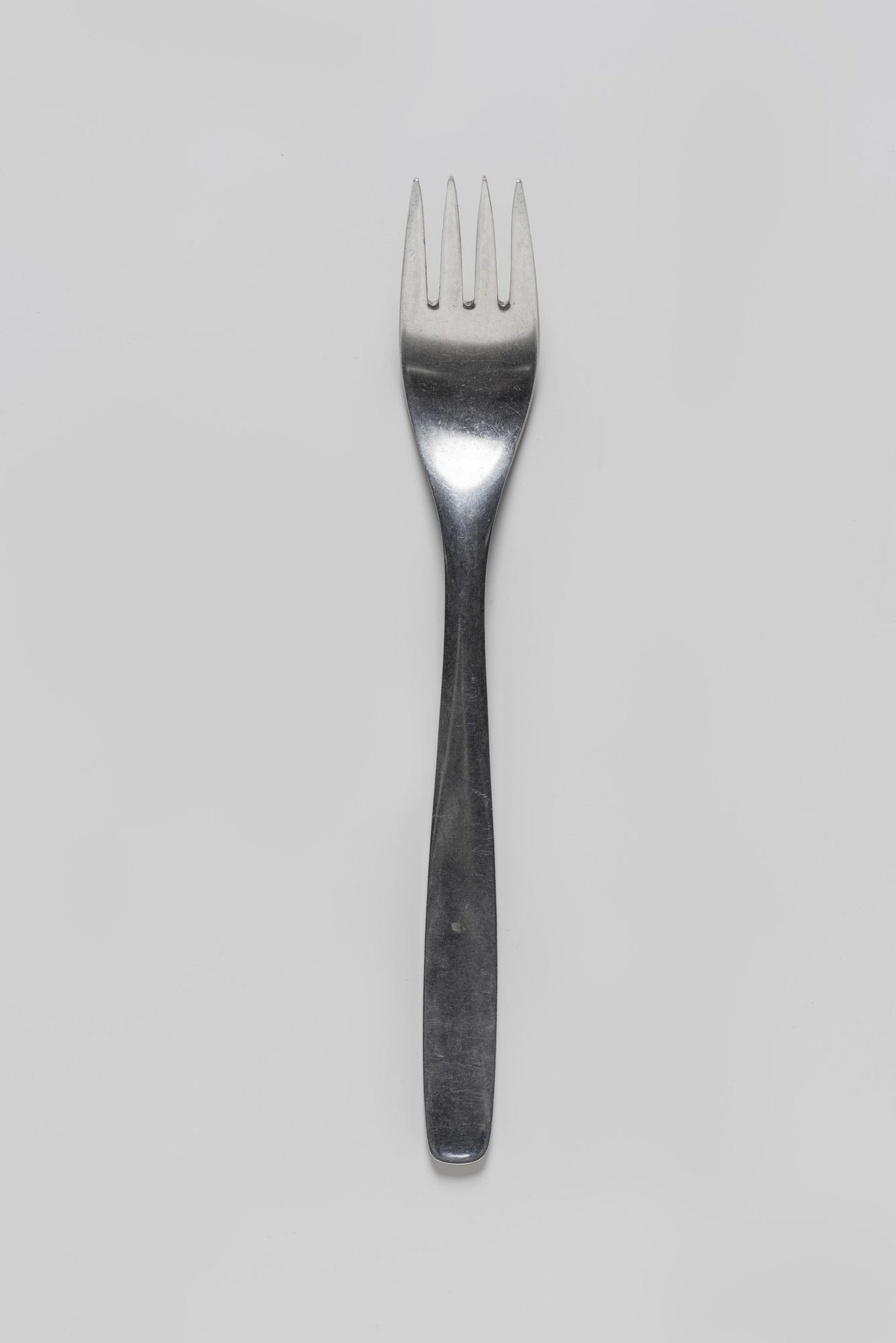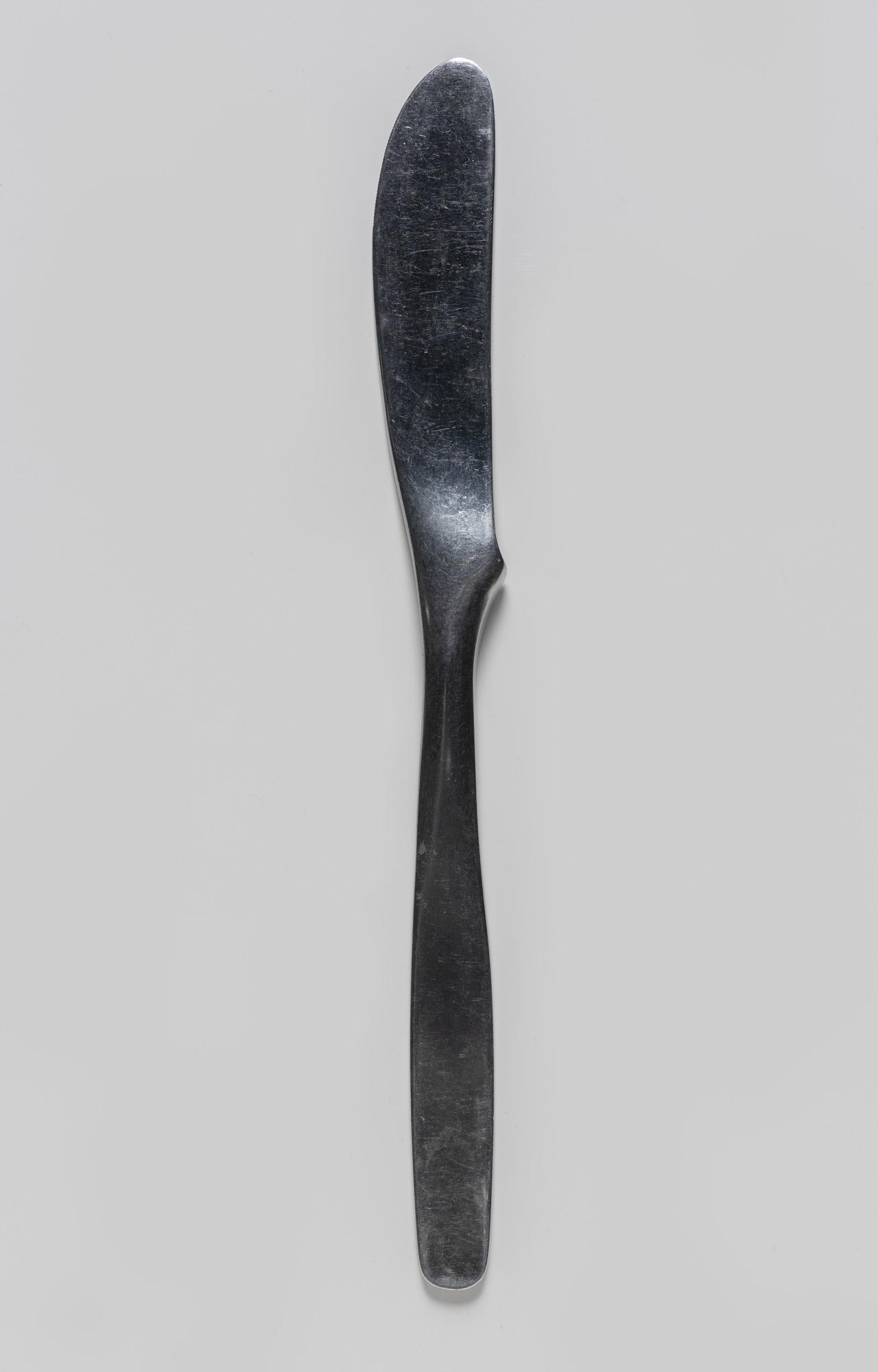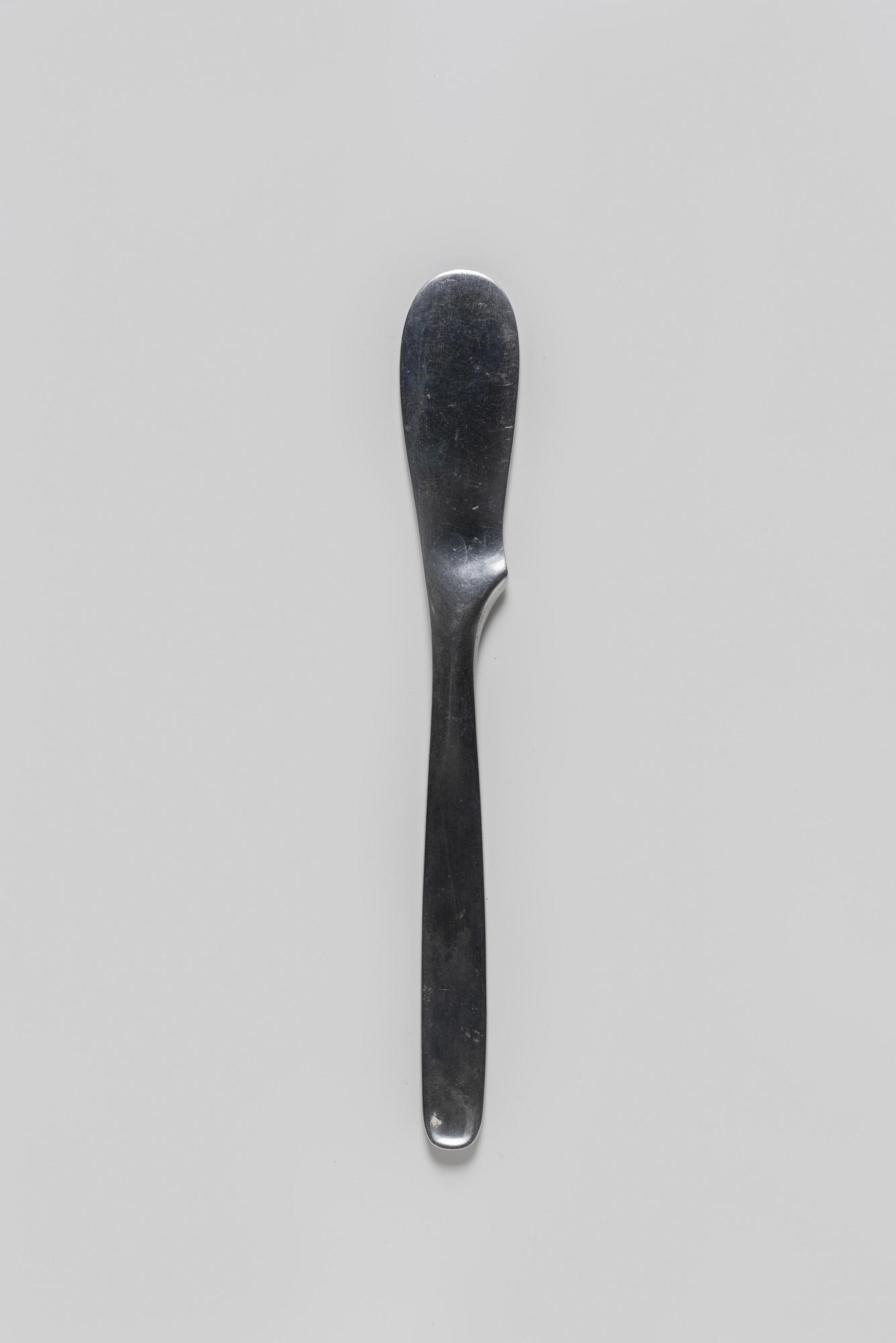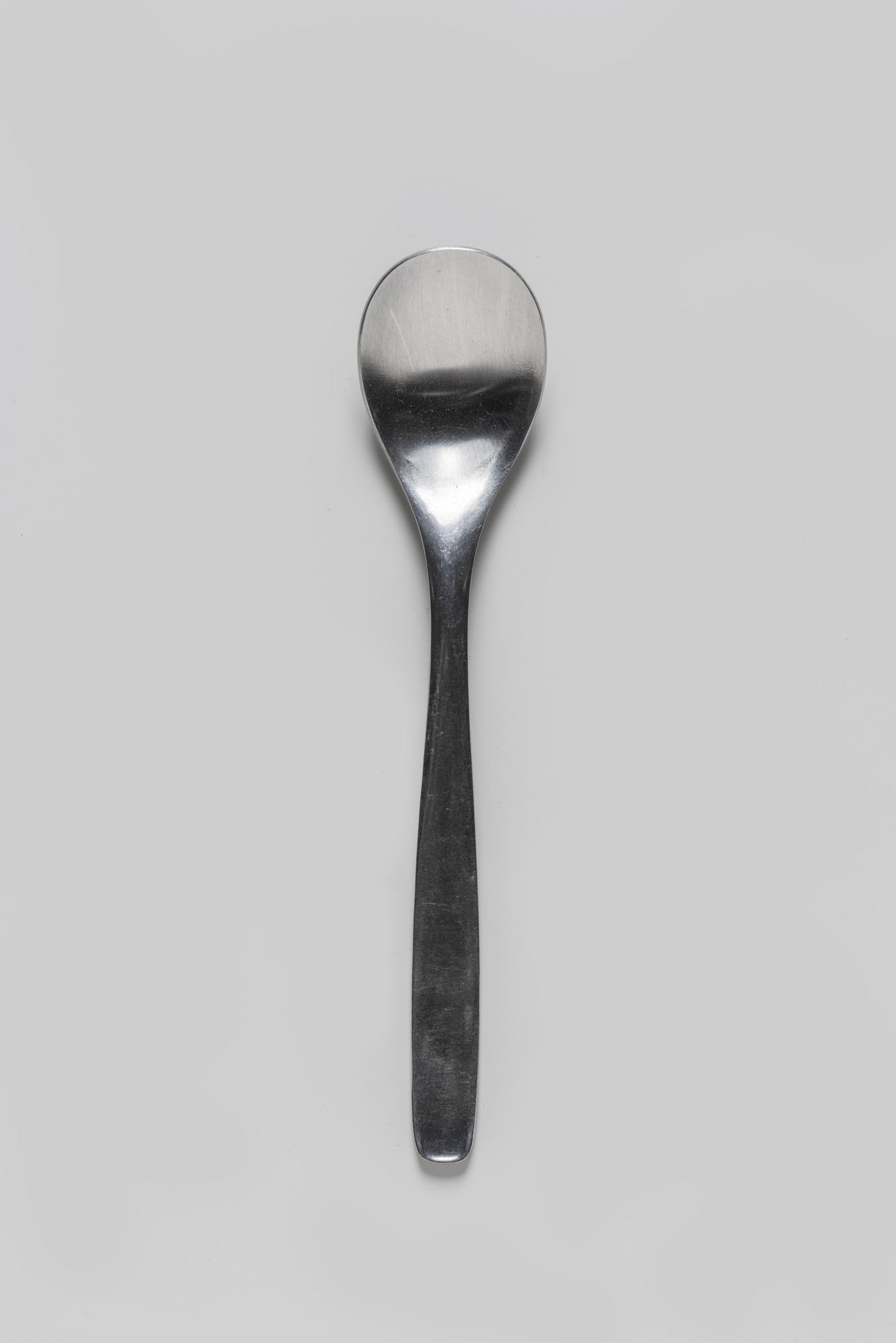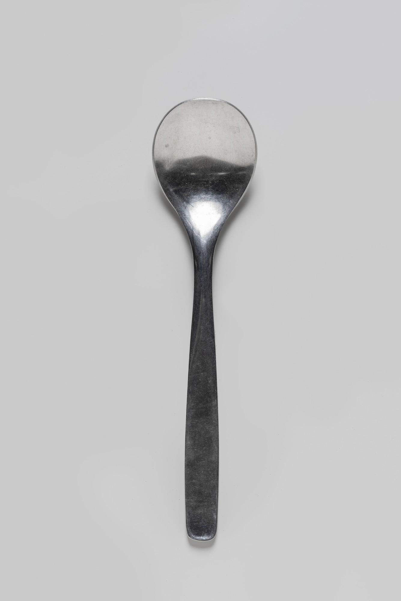 Russel Wright (American, 1904–1976). Six-Piece Flatware Setting, ca. 1950–1958. Stainless steel, Fork (a): 1 1/8 × 1 × 7 3/16 in. (2.9 × 2.5 × 18.3 cm) Teaspoon (b): 3/4 × 1 3/8 × 6 1/4 in. (1.9 × 3.5 × 15.9 cm) Soup spoon (c): 3/4 × 1 5/8 × 6 7/8 in. (1.9 × 4.1 × 17.5 cm) Knife (d): 3/8 × 3/4 × 8 1/4 in. (1 × 1.9 × 21 cm) Butter knife (e): 1/2 × 5/8 × 6 1/2 in. (1.3 × 1.6 × 16.5 cm) Salad fork (f): 3/4 × 1 × 6 3/4 in. (1.9 × 2.5 × 17.1 c. Brooklyn Museum, Gift of Andrew Van Styn in memory of Don Magner, 2022.2.3a-f. (Photo: Brooklyn Museum)