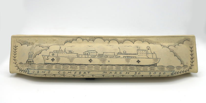 Duke Riley (American, born 1972). No. 73 from the Poly S. Tyrene Memorial Maritime Museum, 2020. Painted, salvaged plastic, ink, wax, 3 1/2 × 17 × 2 1/2 in. (8.9 × 43.2 × 6.4 cm). Brooklyn Museum, Purchase gift of Sharon Fay and Maxine Schaffer, 2023.48.4. © Duke Riley.