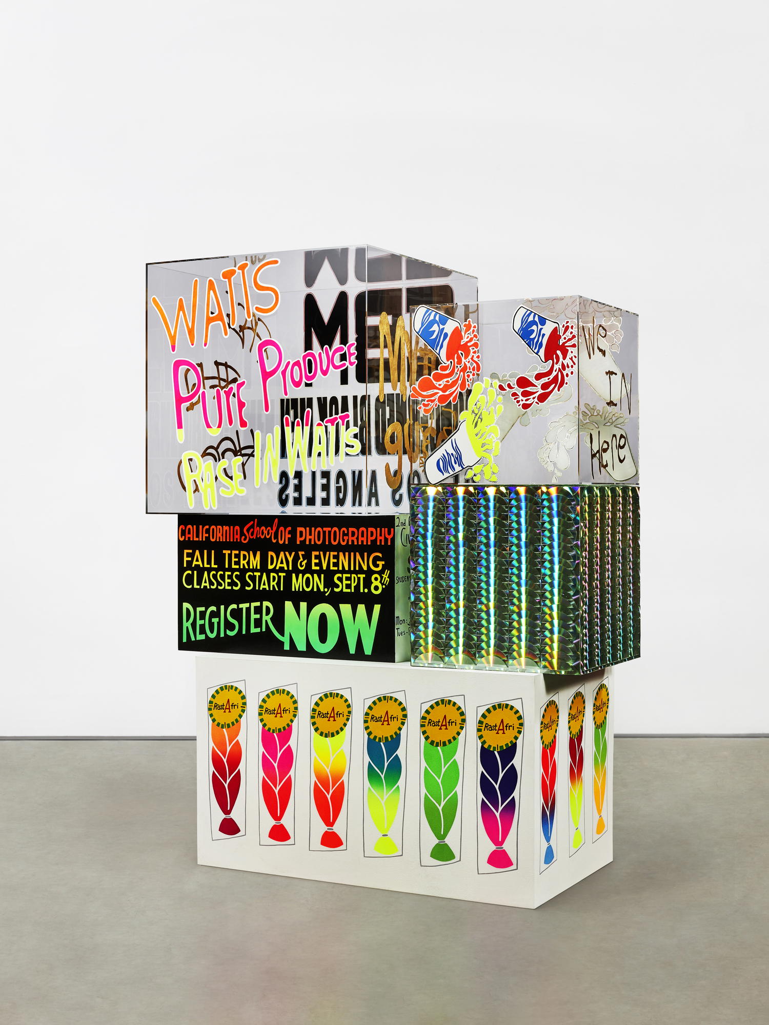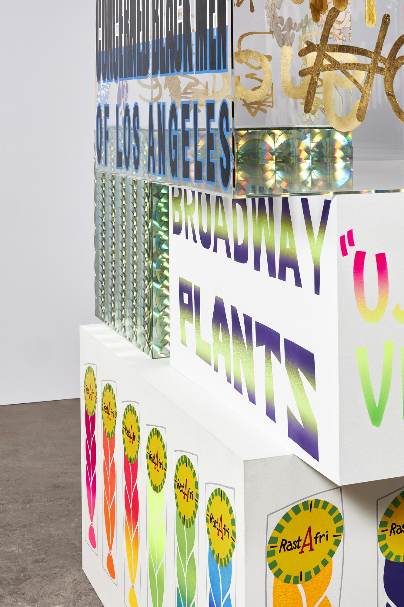 Lauren Halsey (American, born 1987). Untitled, 2023. Acrylic, enamel, and CDs on acrylic and wood, 86 3/4 × 63 × 36 in. (220.3 × 160 × 91.4 cm). Brooklyn Museum, Purchase gift of Ryan Gollan, in honor of the Brooklyn Museum’s 200th Anniversary, 2024.42. © Lauren Halsey. (Photo: David Kordansky Gallery)