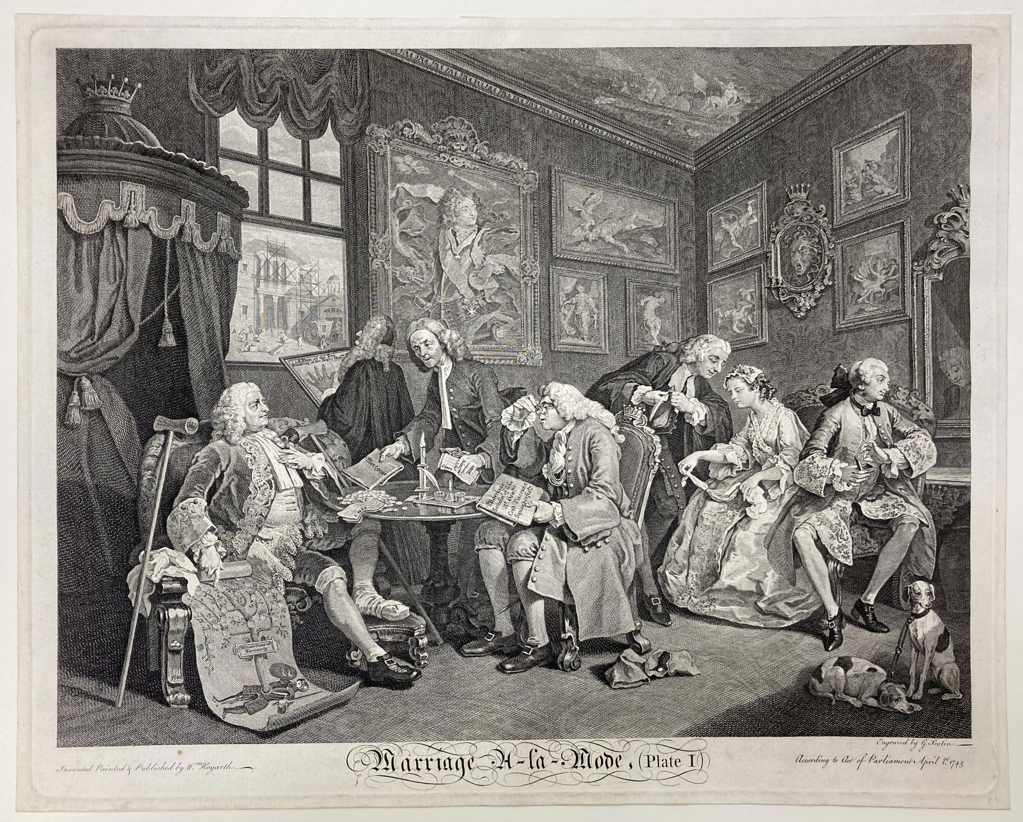 Gerard Scotin (French); After William Hogarth (British, 1697–1764). The Contract from Marriage A-La-Mode, 1745. Engraving on heavy laid paper, image: 15 1/16 x 18 7/16 in. (38.3 x 46.8 cm). Brooklyn Museum, Bequest of Samuel E. Haslett, 22.1895. (Photo: Brooklyn Museum)