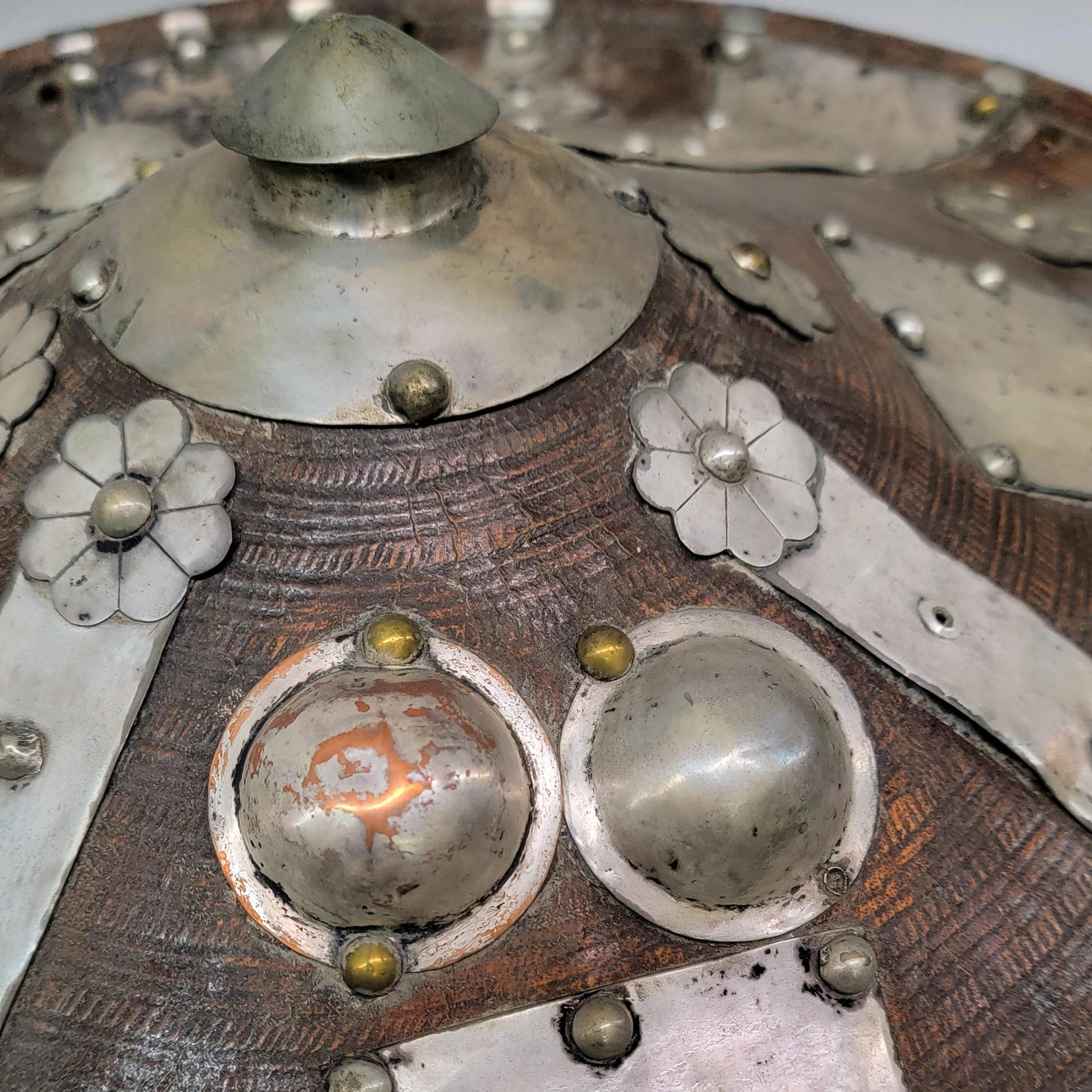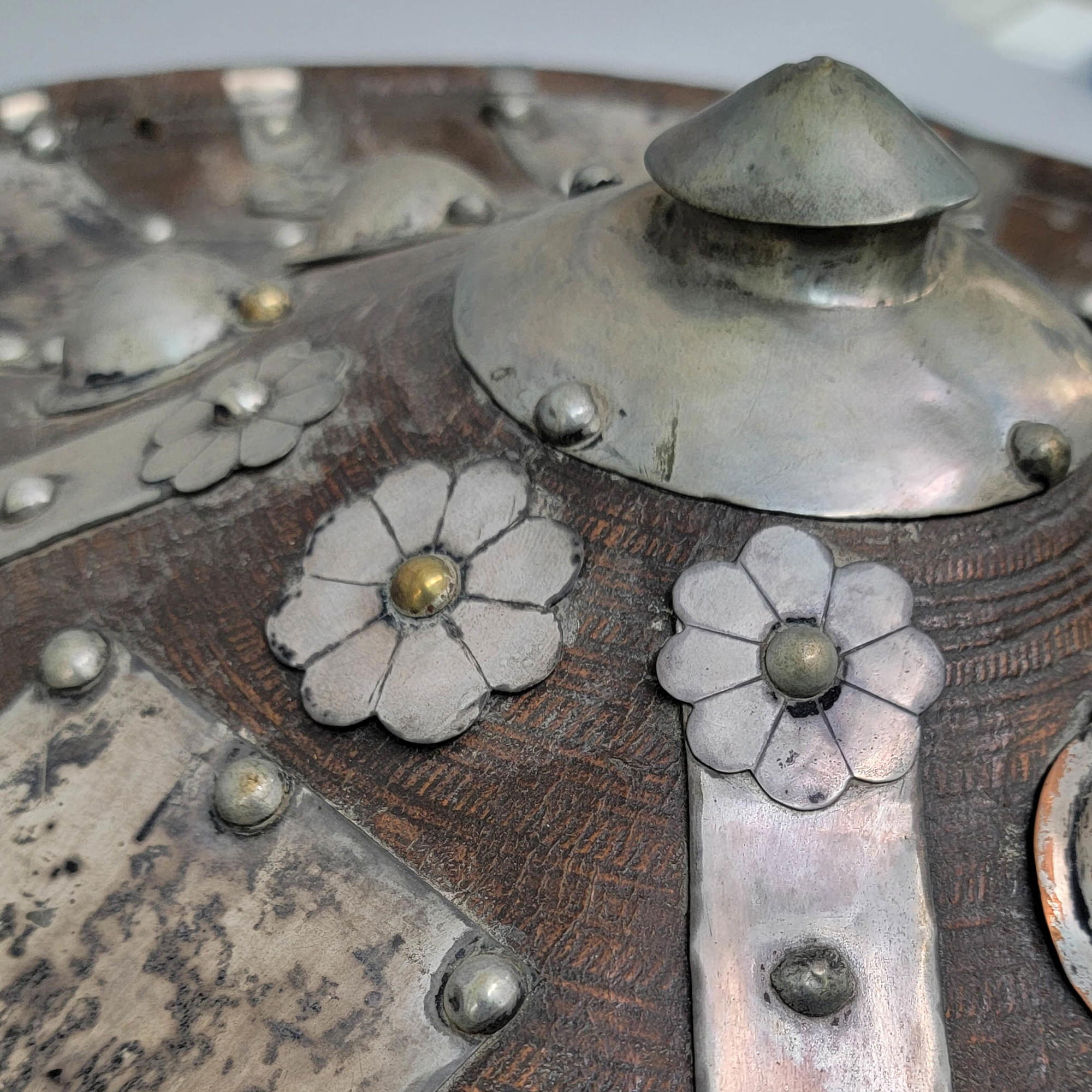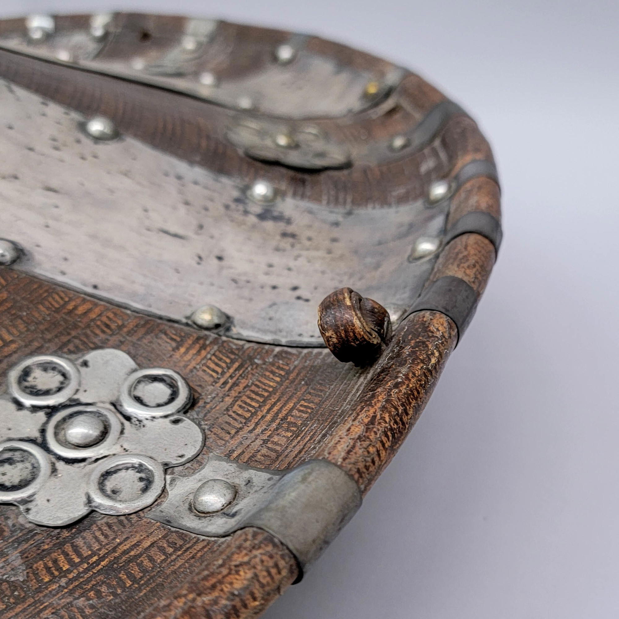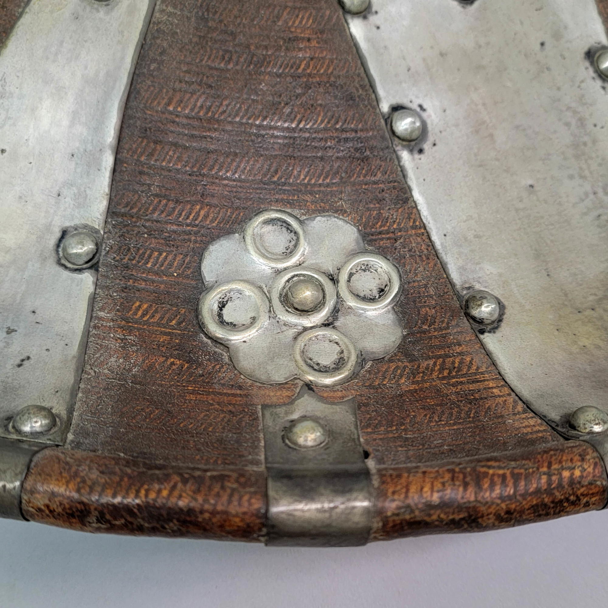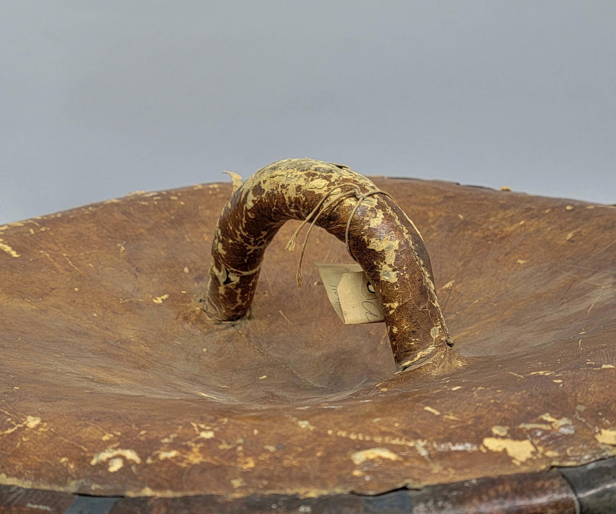 Rhinoceros, hippopotamus or buffalo hide, iron, copper alloy