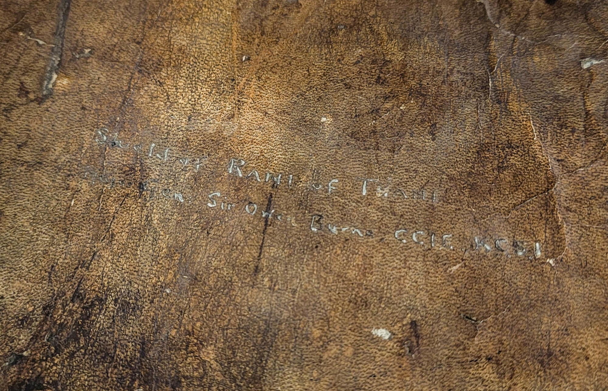 Inscription located on the inside of the shield, "Shield of Rani of [Illegible] / [Illegible] Sir Owen Burns, C.C.I.E. K.C.S.I."