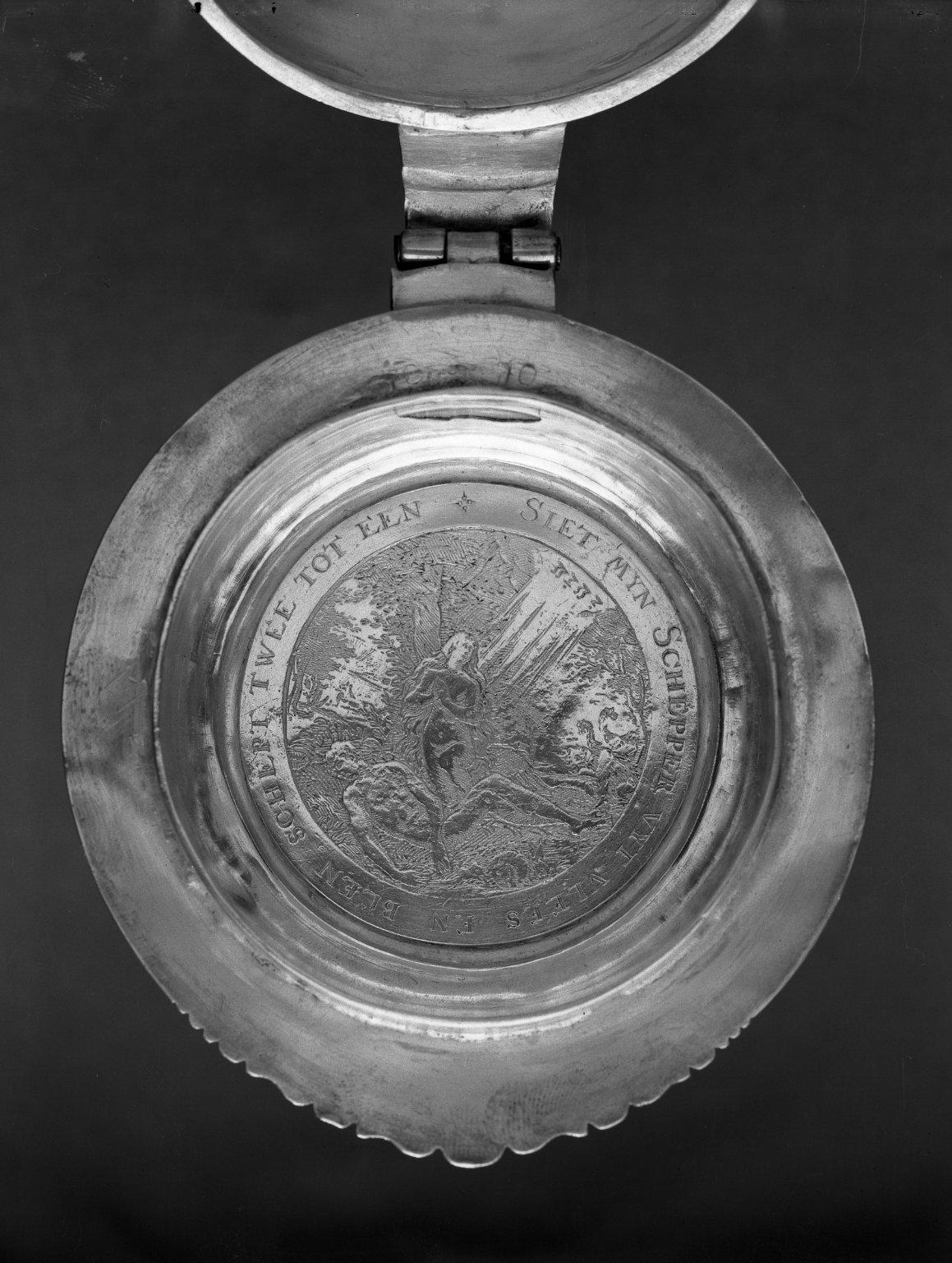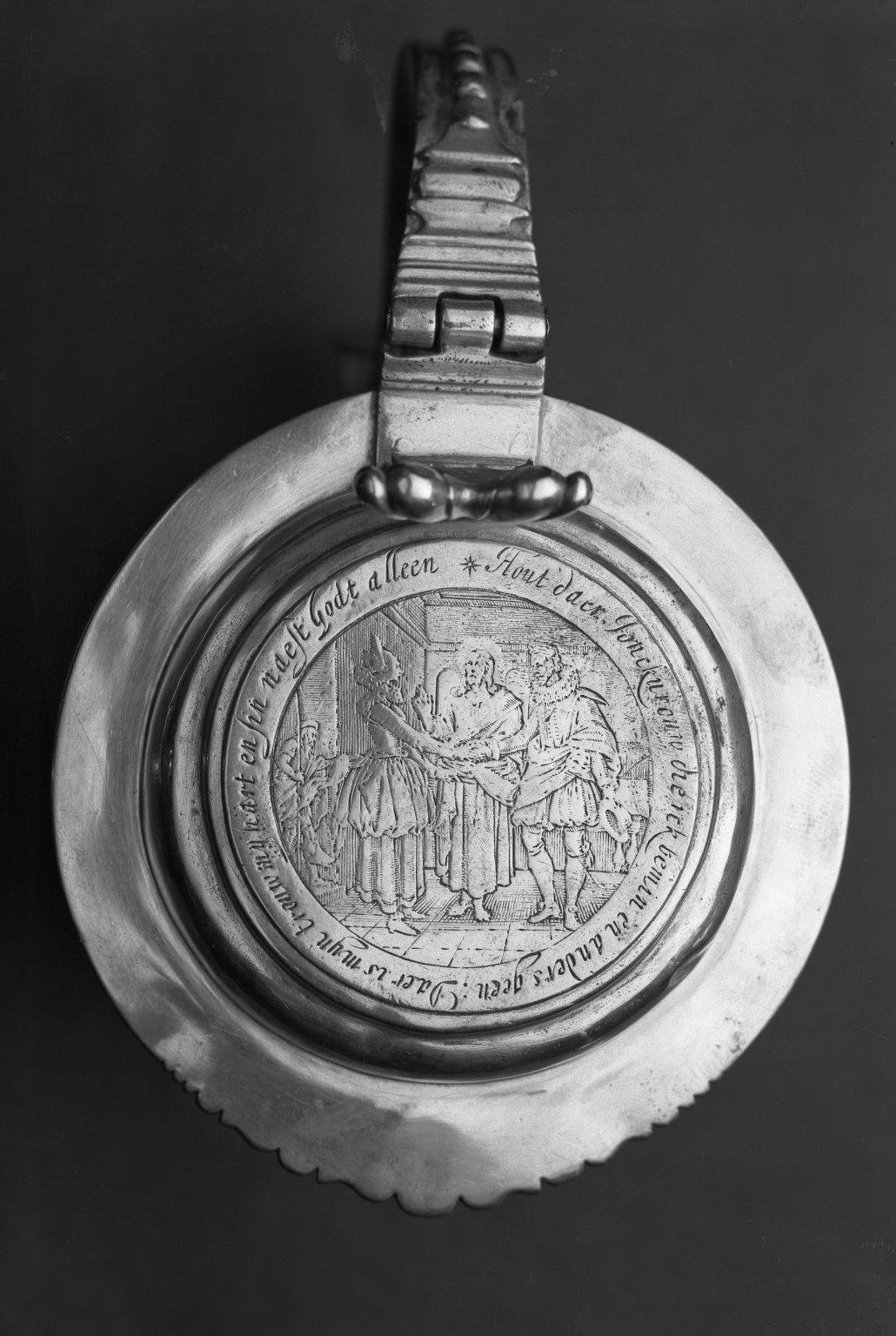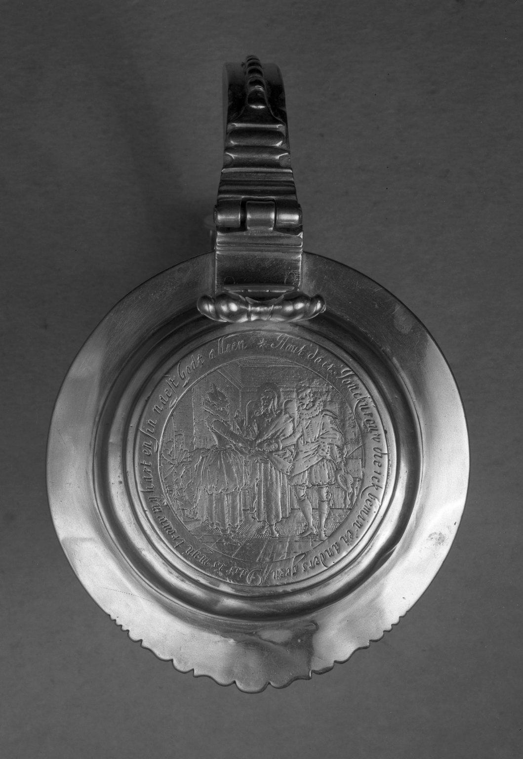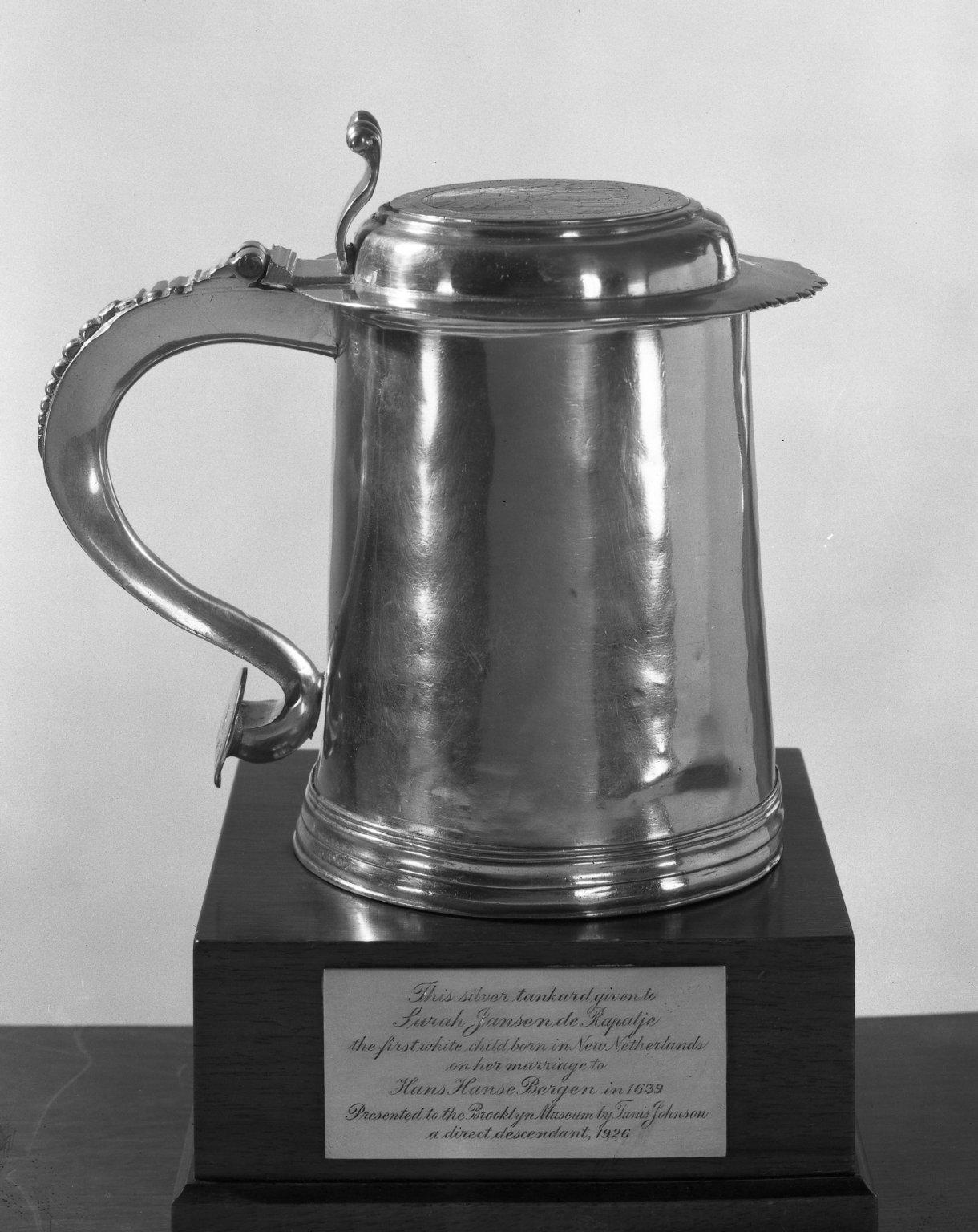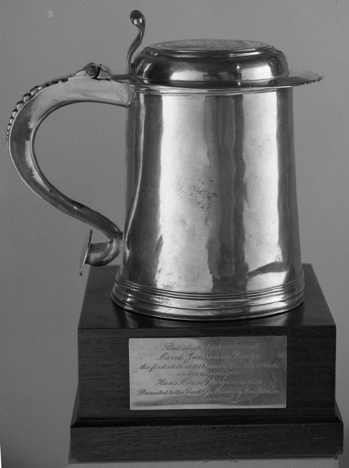 This tankard was made for Jeromus and Jane Remsen, descendants of Sarah Rapalje (1625–1685). A medal that commemorates Sarah’s marriage to Hans Bergen in 1639 was inserted into the top of the tankard. The donor, Tunis Johnson, was a descendant of Rapalje’s.