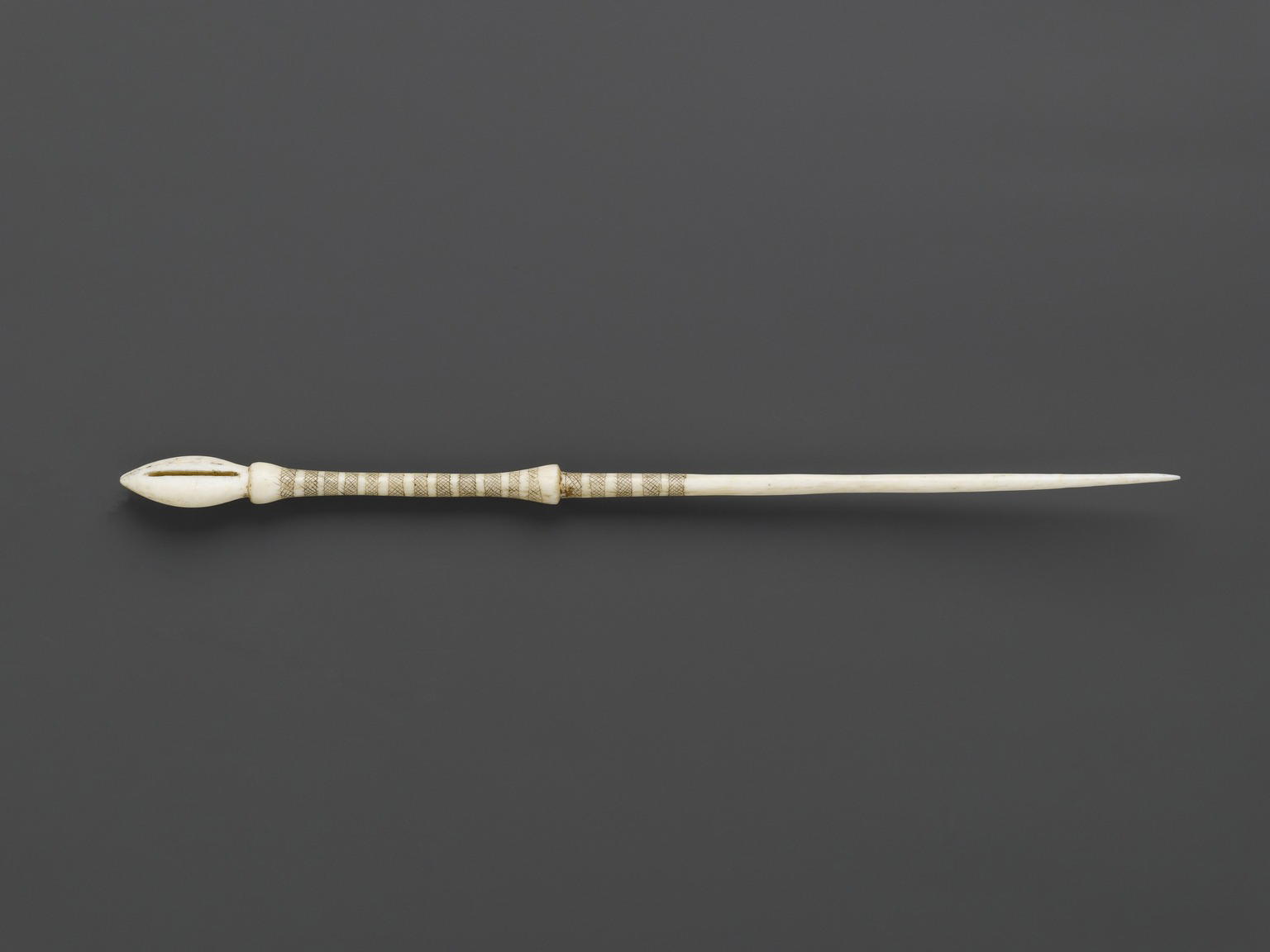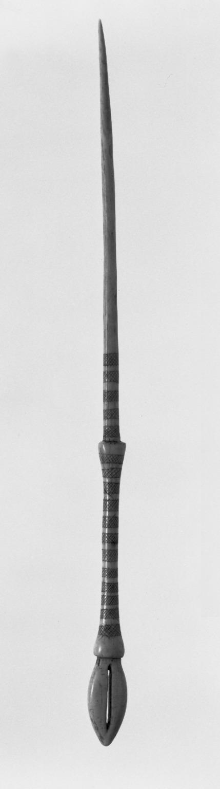Mangbetu; or Zande. Hair Ornament, late 19th or early 20th century. Ivory, pigment, 8 7/16 x 3/8 in. (21.4 x 1 cm). Brooklyn Museum, Museum Expedition 1922, Robert B. Woodward Memorial Fund, 22.697. (Photo: Brooklyn Museum)