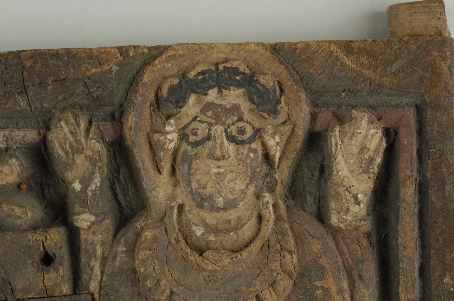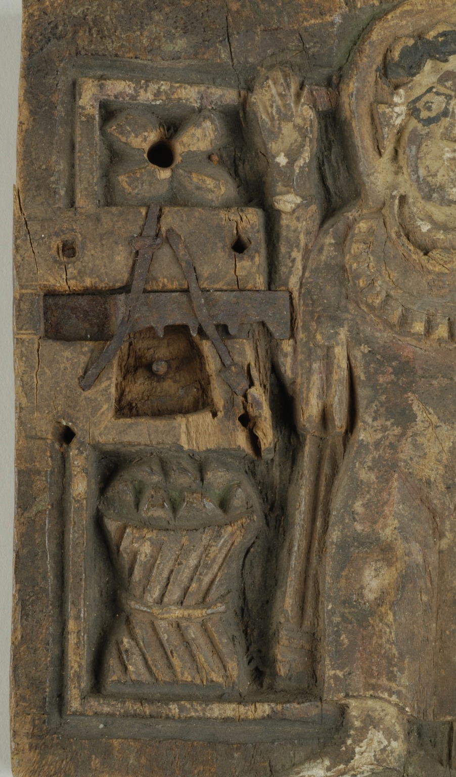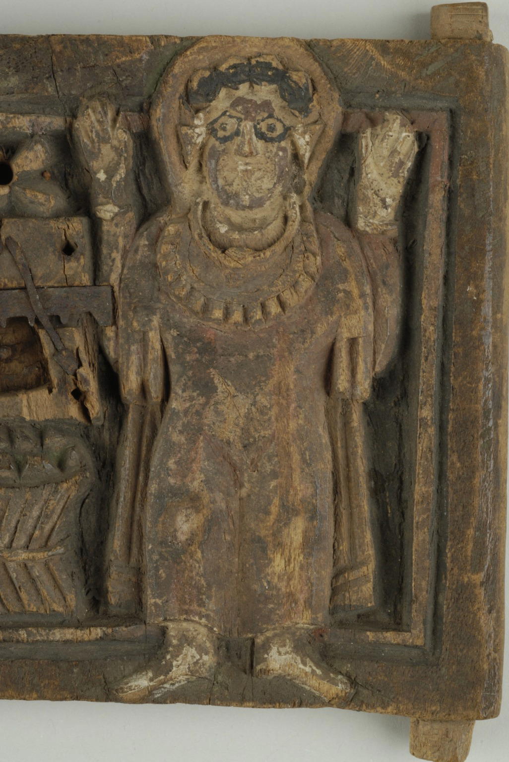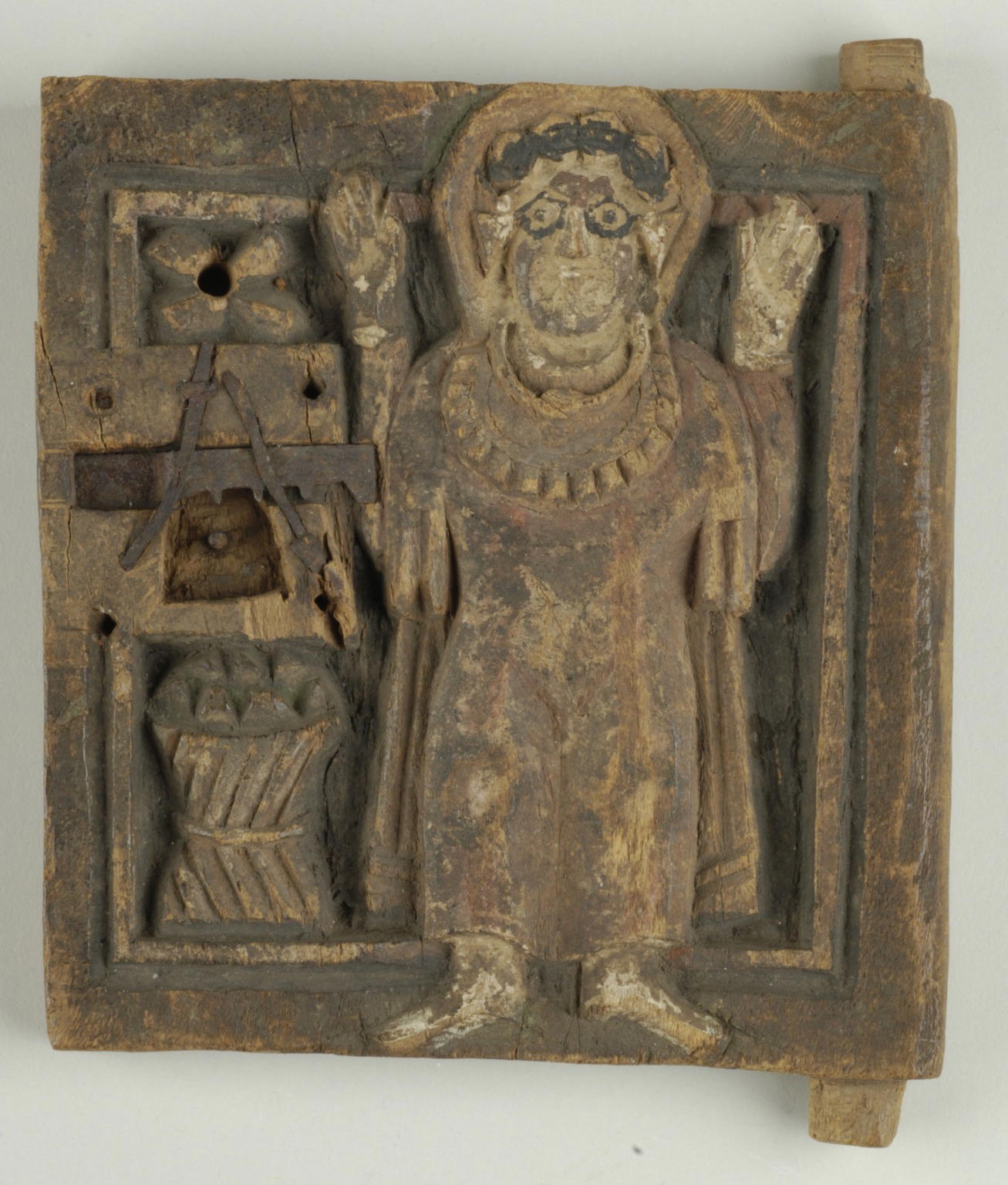 Coptic. Door with Figure of a Saint, 7th century C.E. or 10th–11th century C.E.. Wood, iron, pigment, 6 13/16 x 5 13/16 x 3/4 in. (17.4 x 14.8 x 2 cm). Brooklyn Museum, Gift of Ruth Tishner Costantino, 30.28. (Photo: Brooklyn Museum (in collaboration with Index of Christian Art, Princeton University))