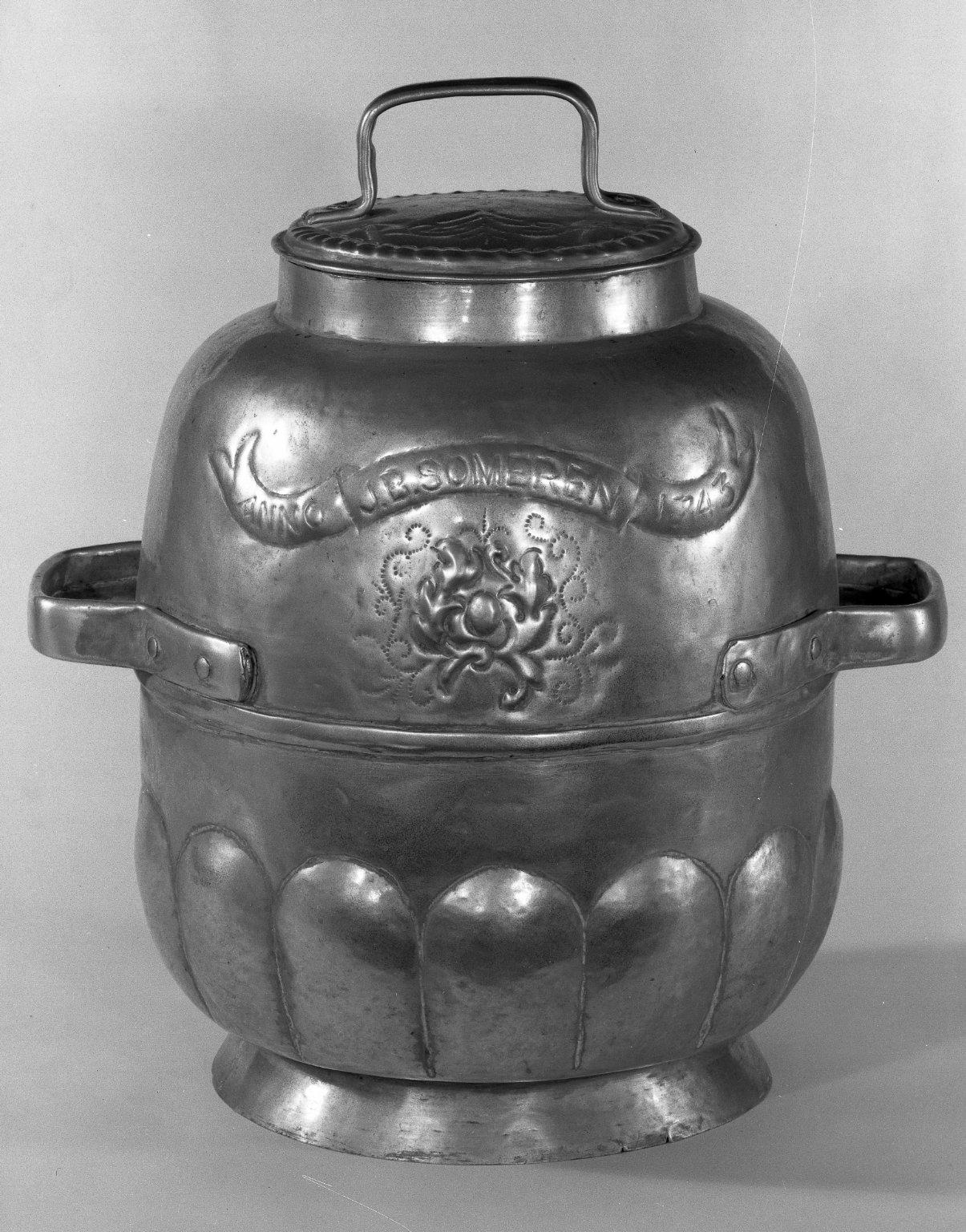 Milk Can with Two Handles, 18th century. Height (including cover): 14 1/2 in. (36.8 cm) Diam at top: 6 in. (15.2 cm) Diam at center: 10 in. (25.4 cm) Diam at base: 8 3/4 in. (22.2 cm). Brooklyn Museum, Bequest of Margaret S. Bedell, 32.359. (Photo: Brooklyn Museum)
