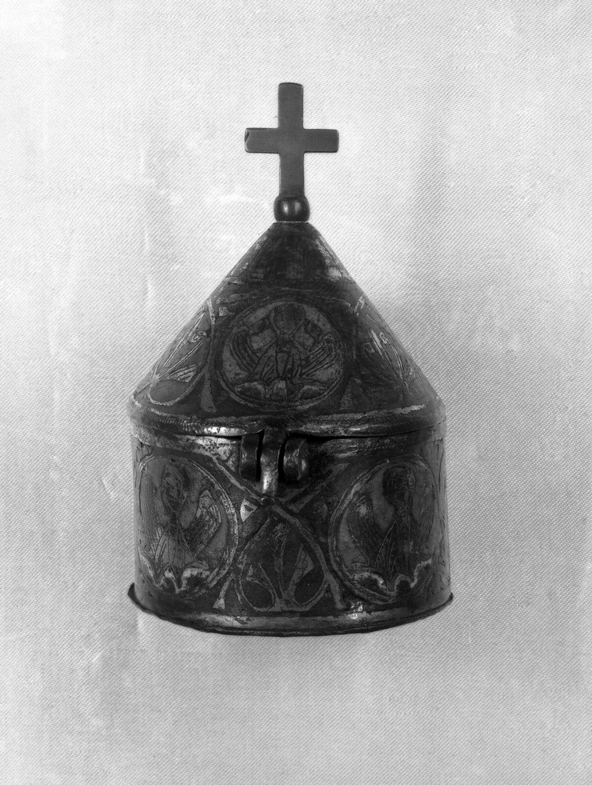 A Pyx, 9th or 14th century (?). Champleve enamel, 4 1/4 x 2 5/8 in. (10.8 x 6.7 cm). Brooklyn Museum, Gift of the executors of the Estate of Colonel Michael Friedsam, 32.614. (Photo: Brooklyn Museum)