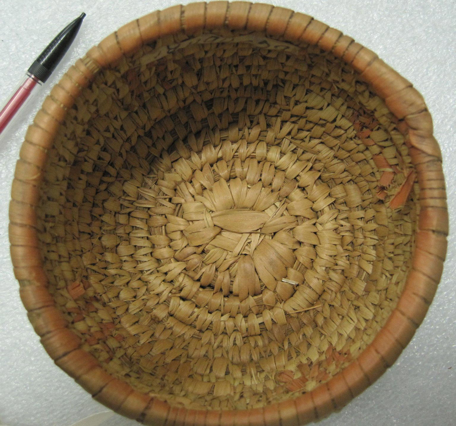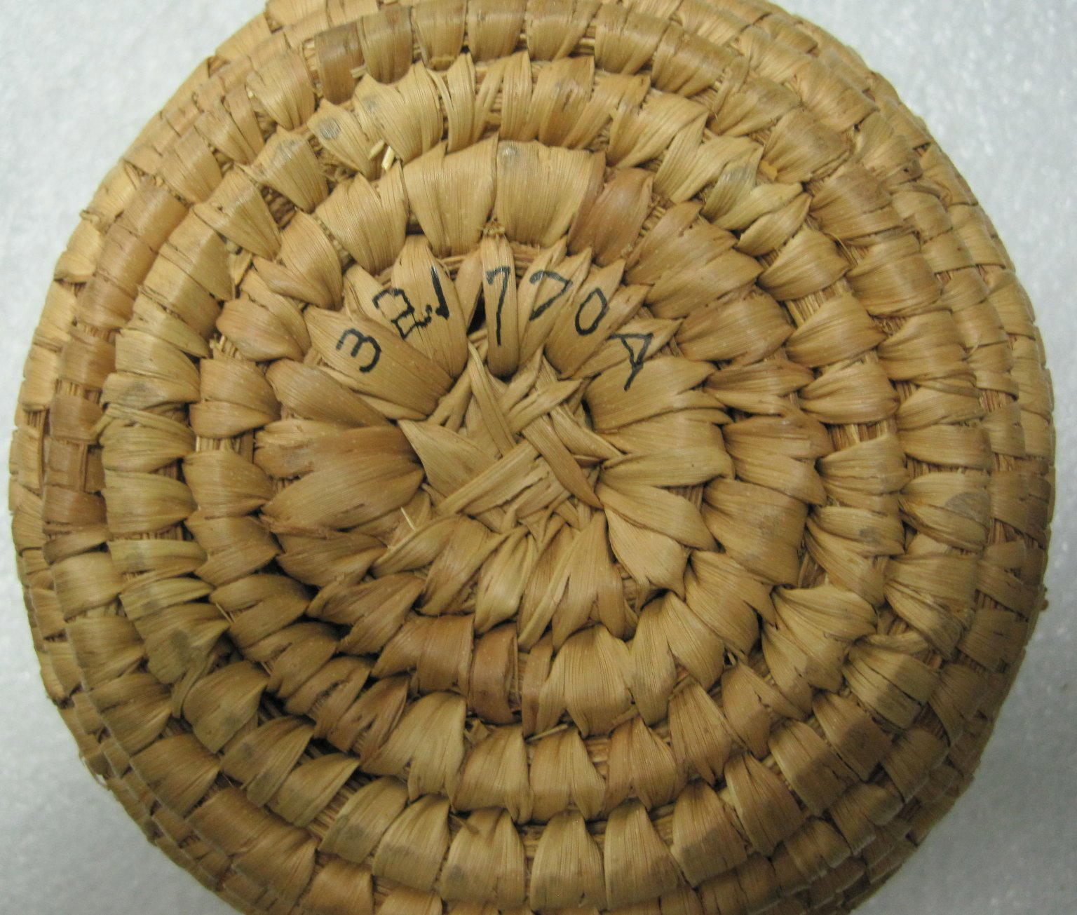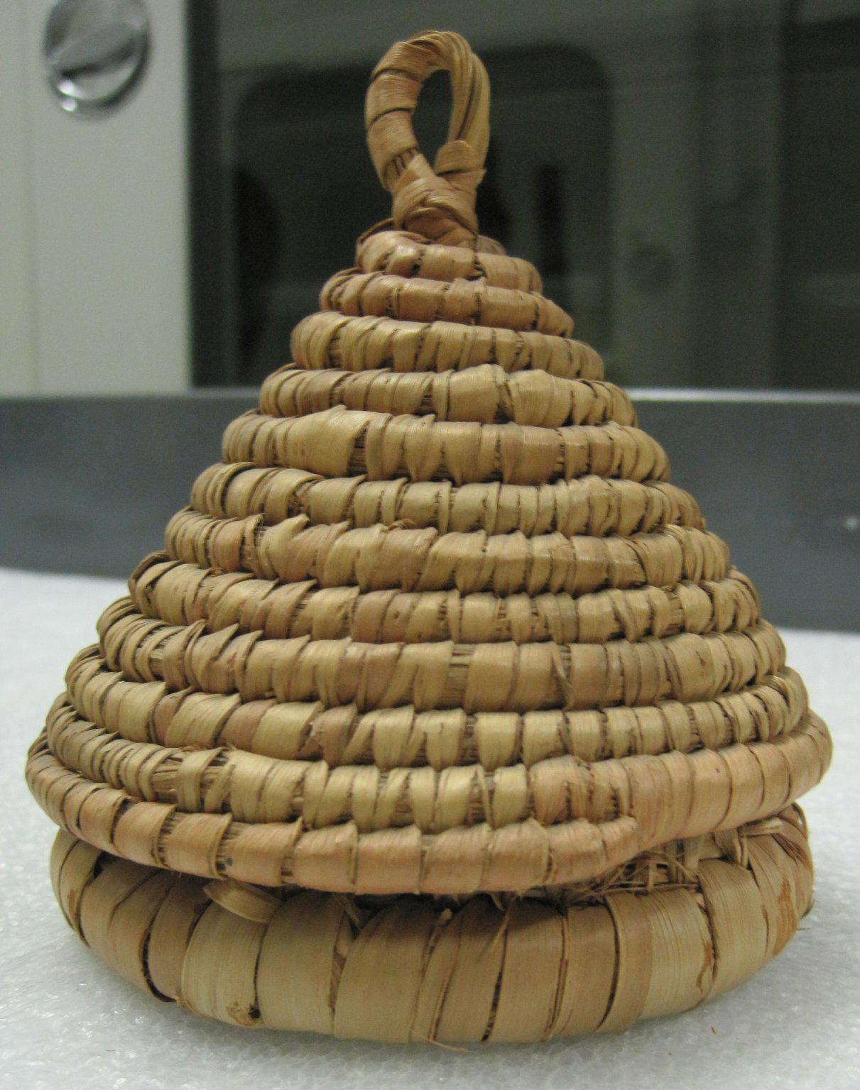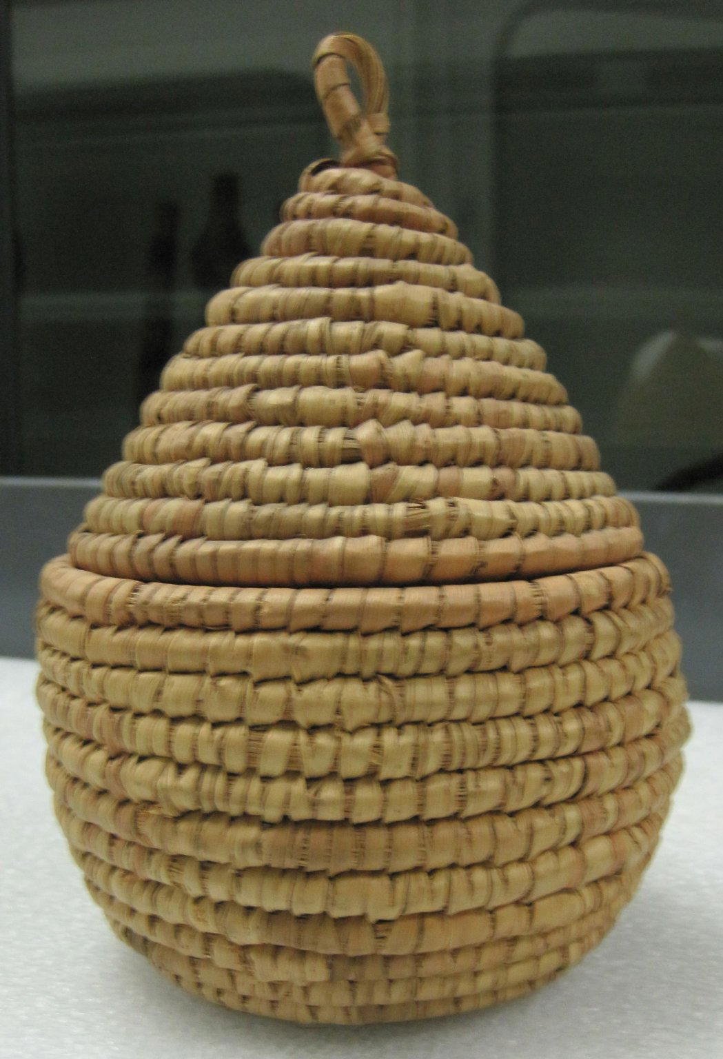 Cone Shaped Basket with Cover, Fiber, cane, raffia, height (incl. loop): 7 1/2 in. diam. (w/o top): 4 1/2 in. Brooklyn Museum, Gift of Theodora Wilbour, 32.1770a-b. (Photo: Brooklyn Museum)