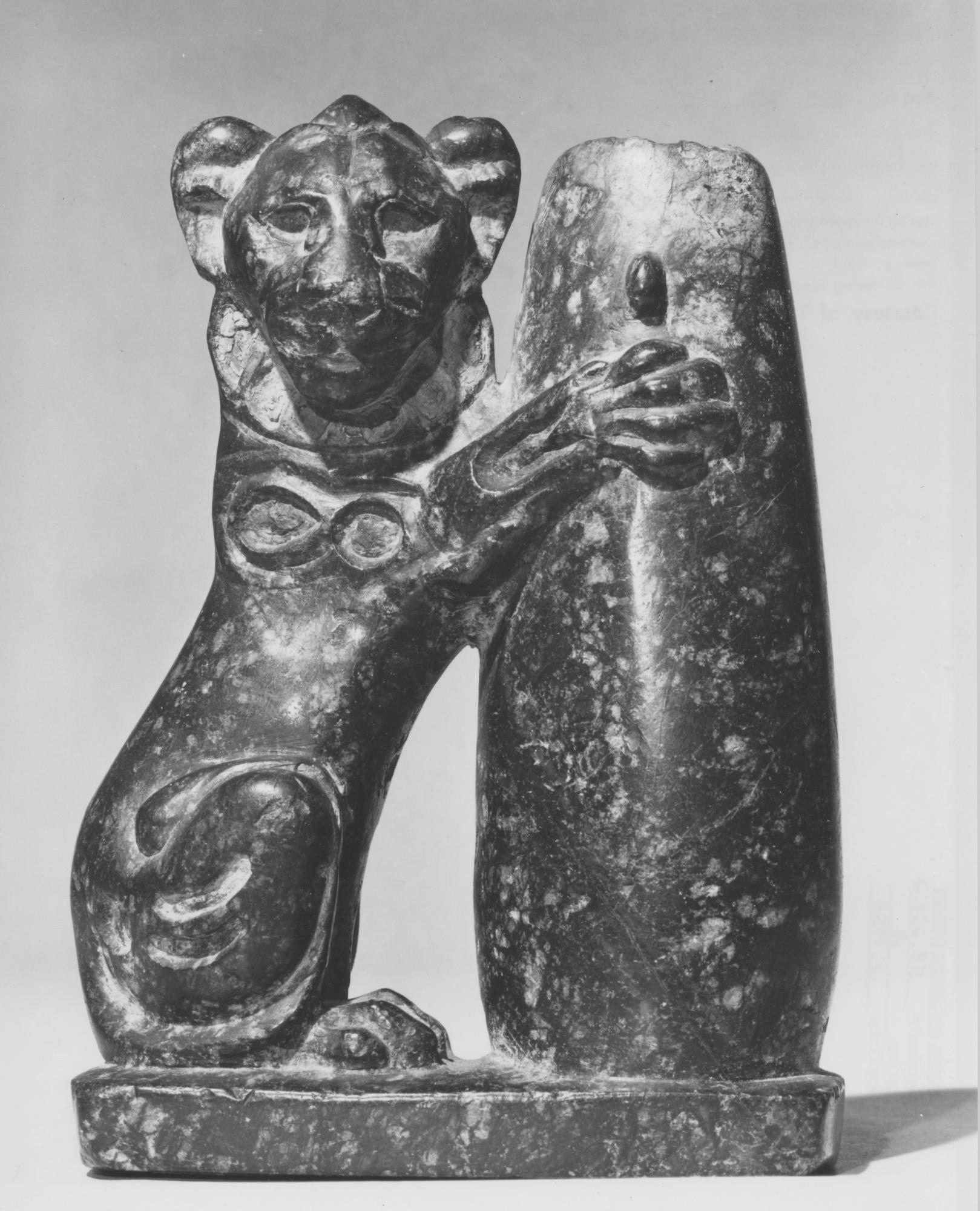 Lion and Ointment Jar, 525–404 B.C.E.. Serpentine, 6 x 1 7/8 x 4 3/16 in. (15.3 x 4.8 x 10.7 cm). Brooklyn Museum, Gift of Henry Hottinger, 53.221.2. (Photo: Brooklyn Museum)