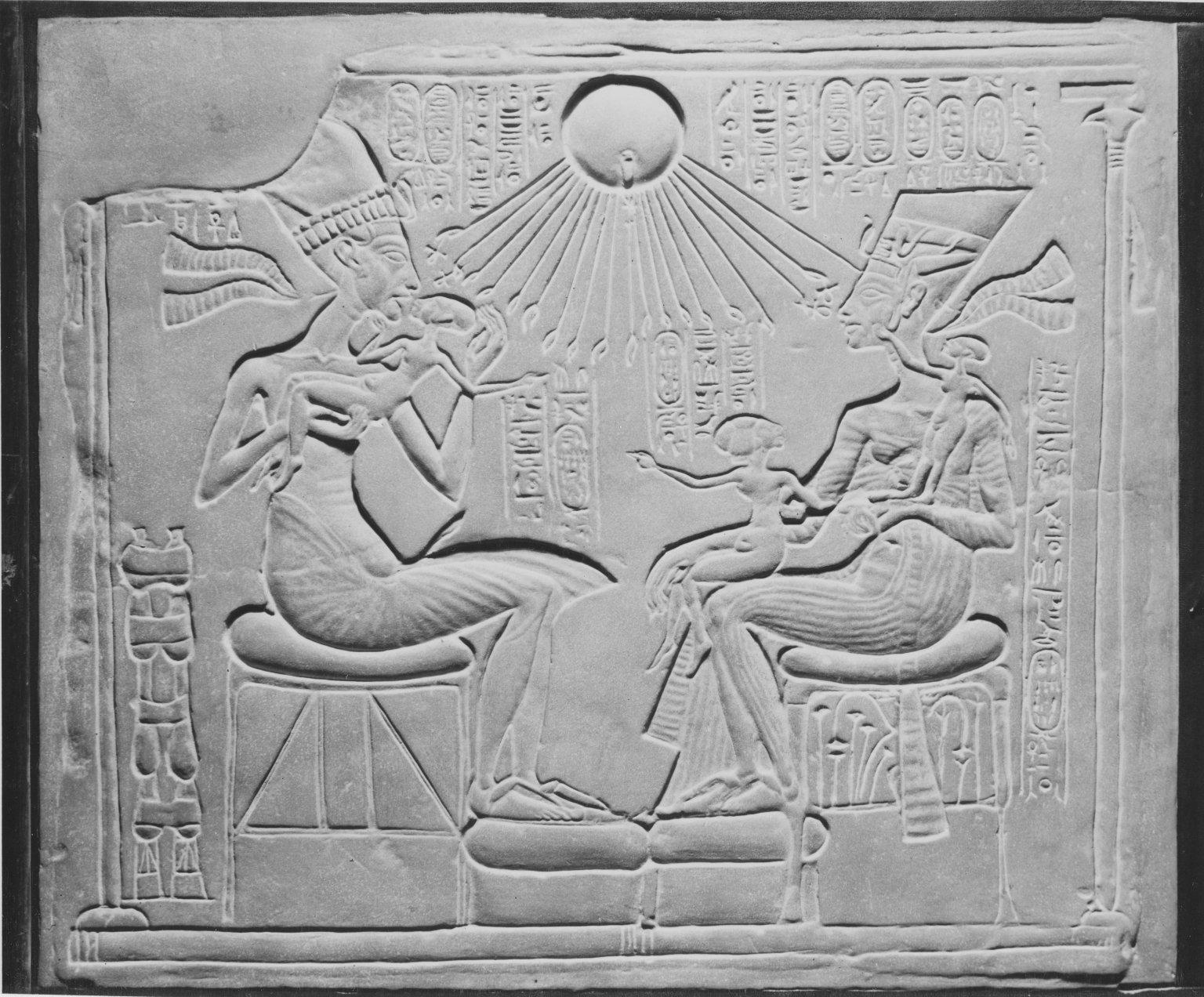 Cast of a Relief of Akhenaten, Nefertiti, and Princesses, ca. 1933 C.E.. Plaster, pigment, 14 5/16 x 16 3/4 x 1 5/16 in. (36.3 x 42.5 x 3.3 cm). Brooklyn Museum, 33.513. (Photo: Brooklyn Museum)