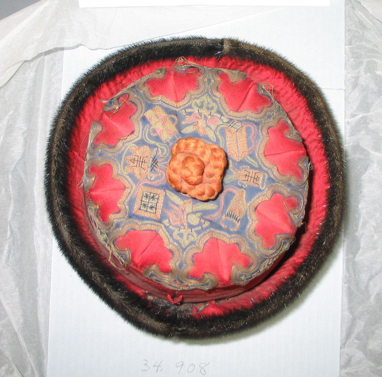 Mandarin Hat, 19th century. Fur, ribbon, embroidery, 5 7/8 x 8 11/16 in. (15 x 22 cm). Brooklyn Museum, Brooklyn Museum Collection, 34.908. (Photo: Brooklyn Museum)