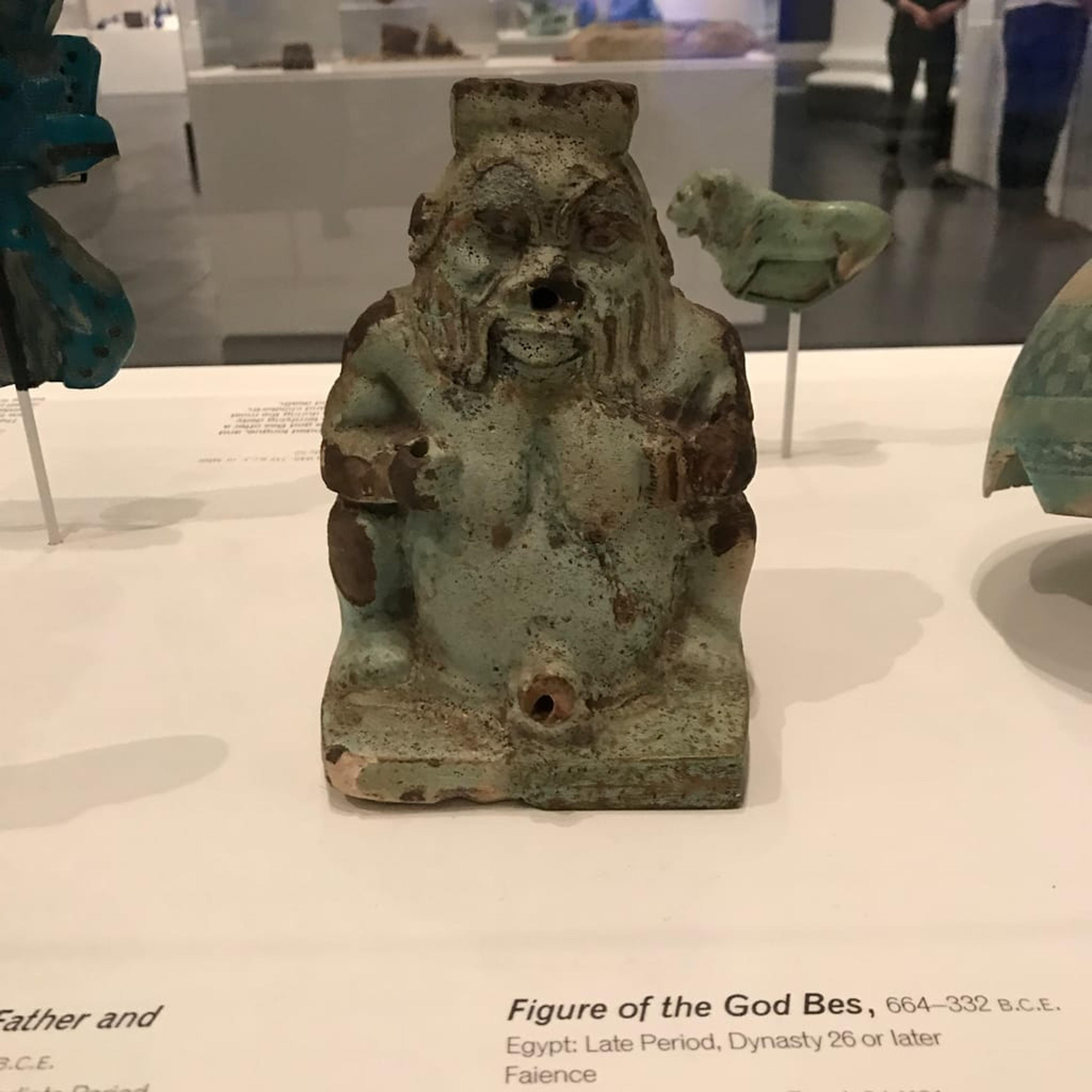 "She" appears to have breasts and an umbilical cord, which, to me, implies birth, etc...I see what you mean! HIs "breasts" are intended, here, as a sign of his girth which implies prosperity and fertility of the earth. The umbilical chord-like structure has more to do with this object's function as a water clock.Interesting! Thanks!You're welcome! There is another image of Bes in this case and more on the third floor that give you a better idea of how the god was typically depicted!Gotcha!