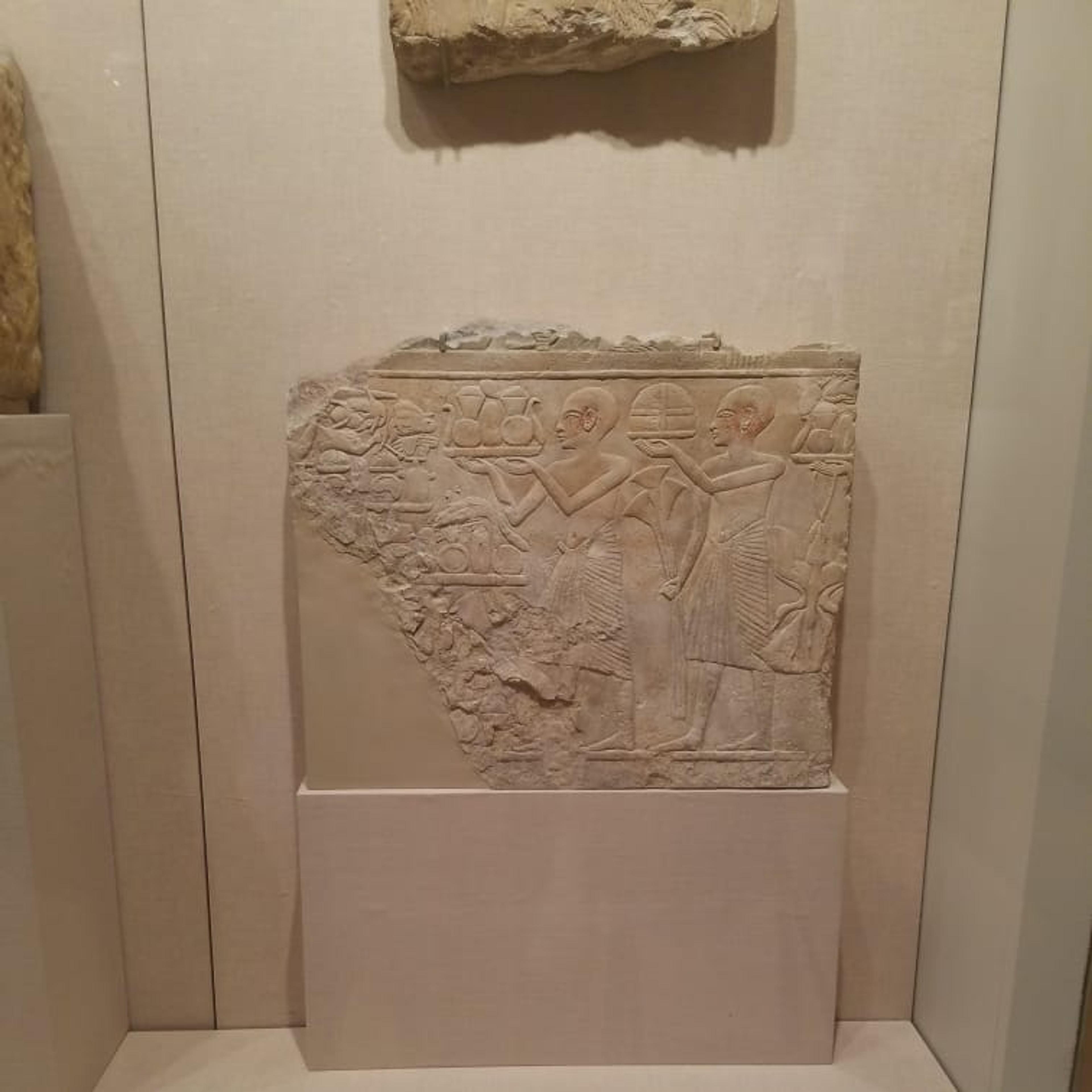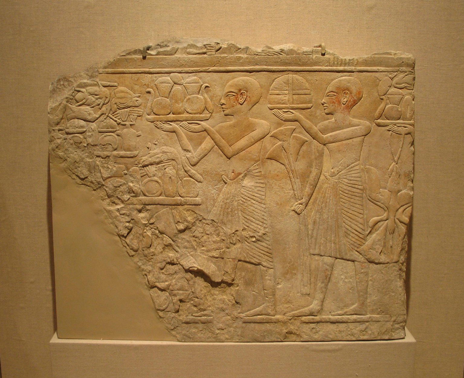 This relief came from a tomb. In ancient Egyptian afterlife beliefs, scenes like this were pretty necessary. While living in the afterlife, a person would still need to eat and drink, just like in their previous life. Burials would contain stores of food and priests would continue to make food offerings to the deceased after the funeral had ended. Scenes of offerings, particularly food offerings, would be able to supplement or function as actual food would have. This is a fragment of what would have been a much larger scene and placed among other reliefs in the tomb. These reliefs, along with other objects like coffins, were all part of the equipment a person would need for the afterlife.