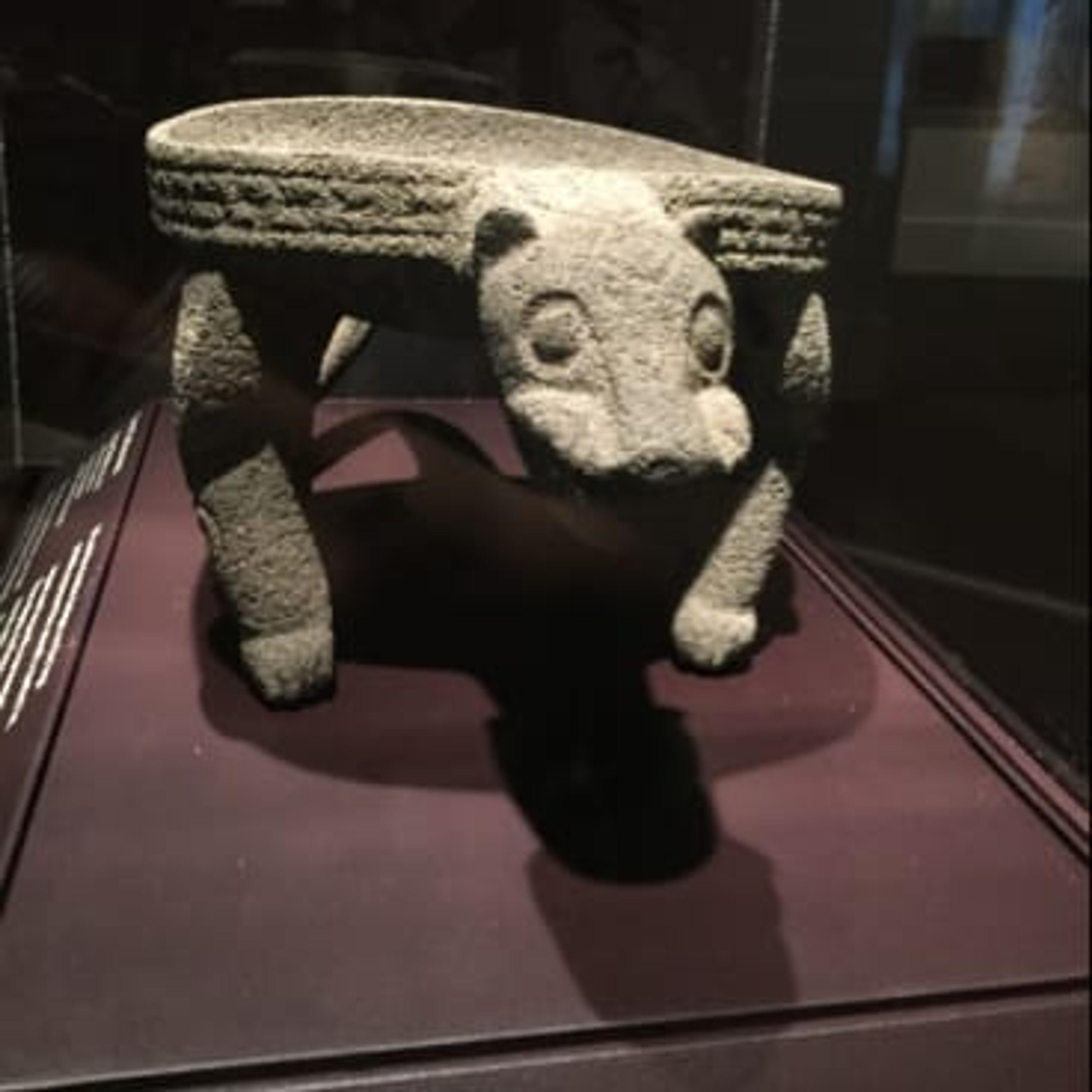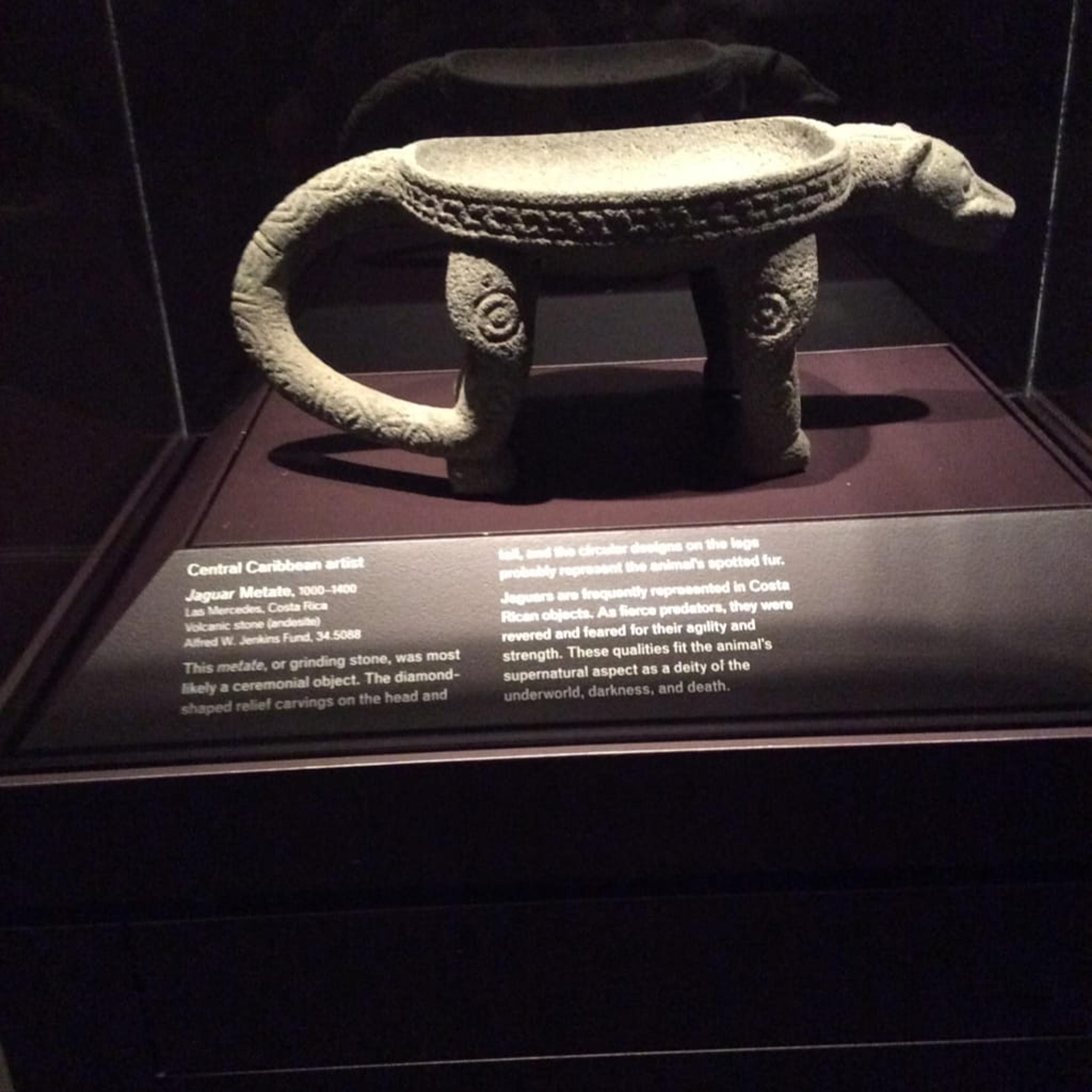 It looks like a table, but it's actually a metate or grinding stone. It comes from Costa Rica. It is very elaborate and doesn't show any signs of use, so it was likely a ceremonial object. The jaguar, one of the most powerful land-based animals in the region, was often tied to power and royalty.What kind of items would people grind with this metate? How was it used in ceremonies?